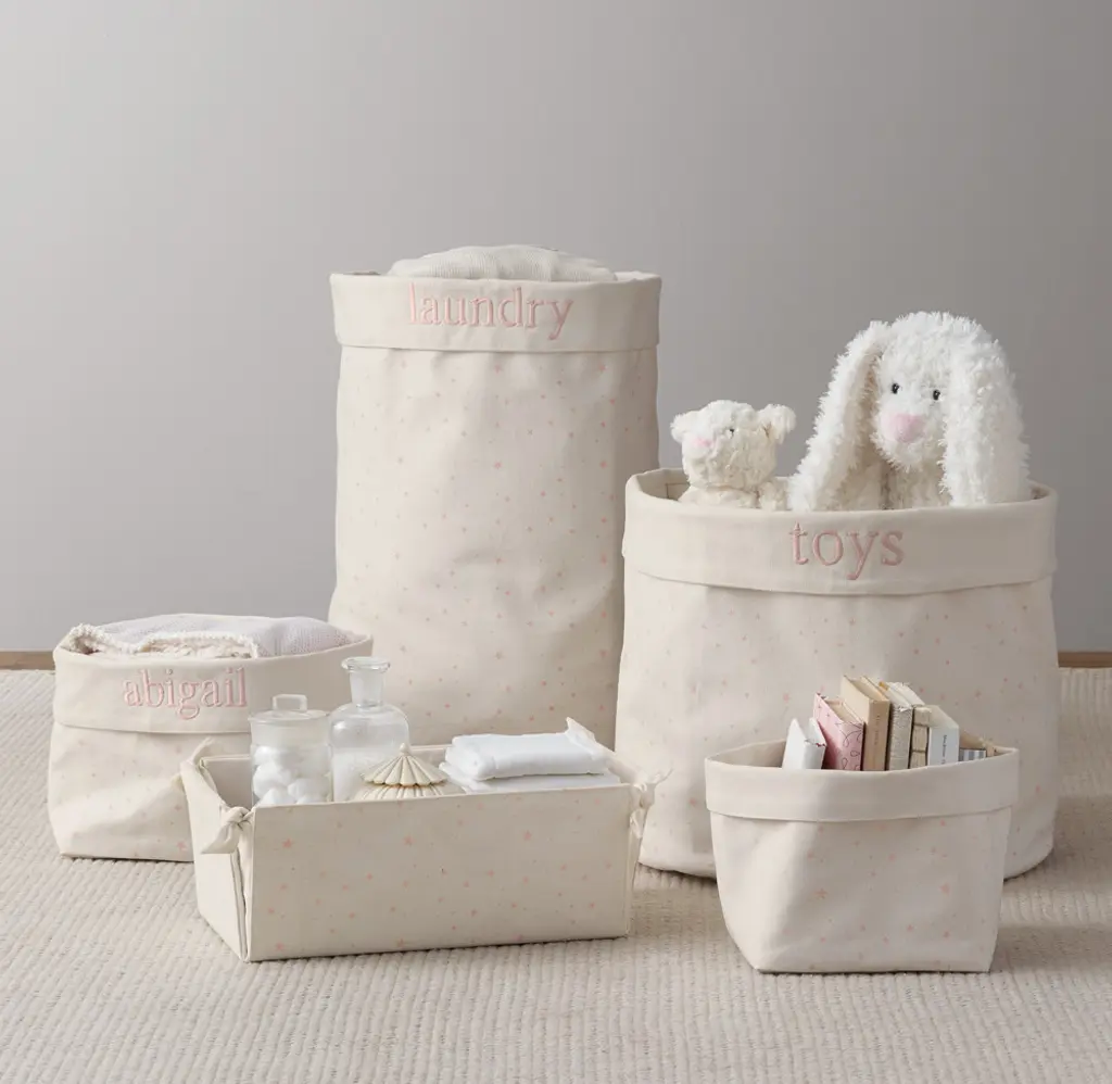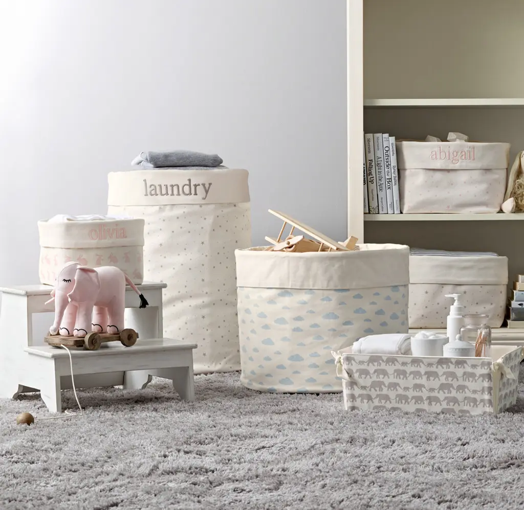 Marching elephants and curious bunnies, twinkling stars and floating clouds – our favorite childhood themes transform durable cotton canvas into a sweet storage solution for the nursery.
