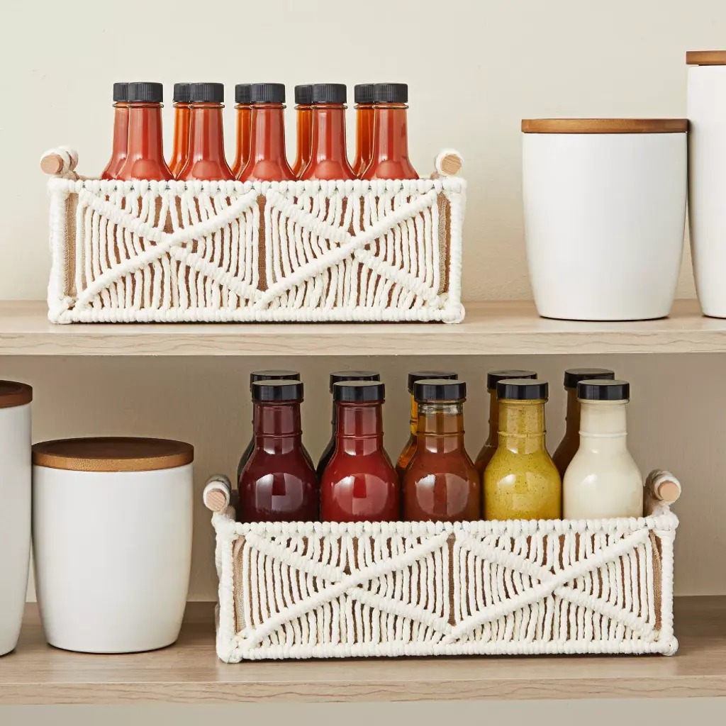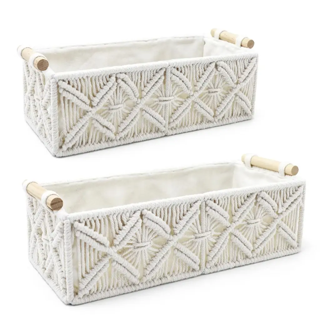 This set of 2 rectangle baskets provides versatile storage for a range of items, including towels, clothing, beauty products, spices, and general household items, all while complementing your beachy room décor aesthetic or macrame decor. Place our macrame storage baskets inside the bathroom, laundry room, kitchen, living room, and bedroom for decorative and convenient storage. These bohemian-style cute baskets are also great for storing diapers, toys, wipes, and other baby supplies. Each basket organizer comes in 2 sizes that you can stack inside each other when not in use.