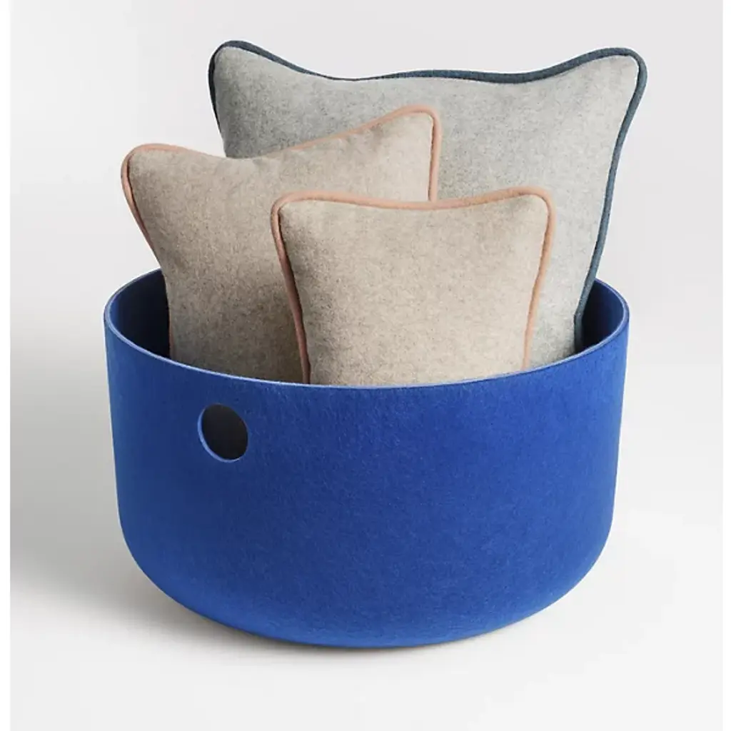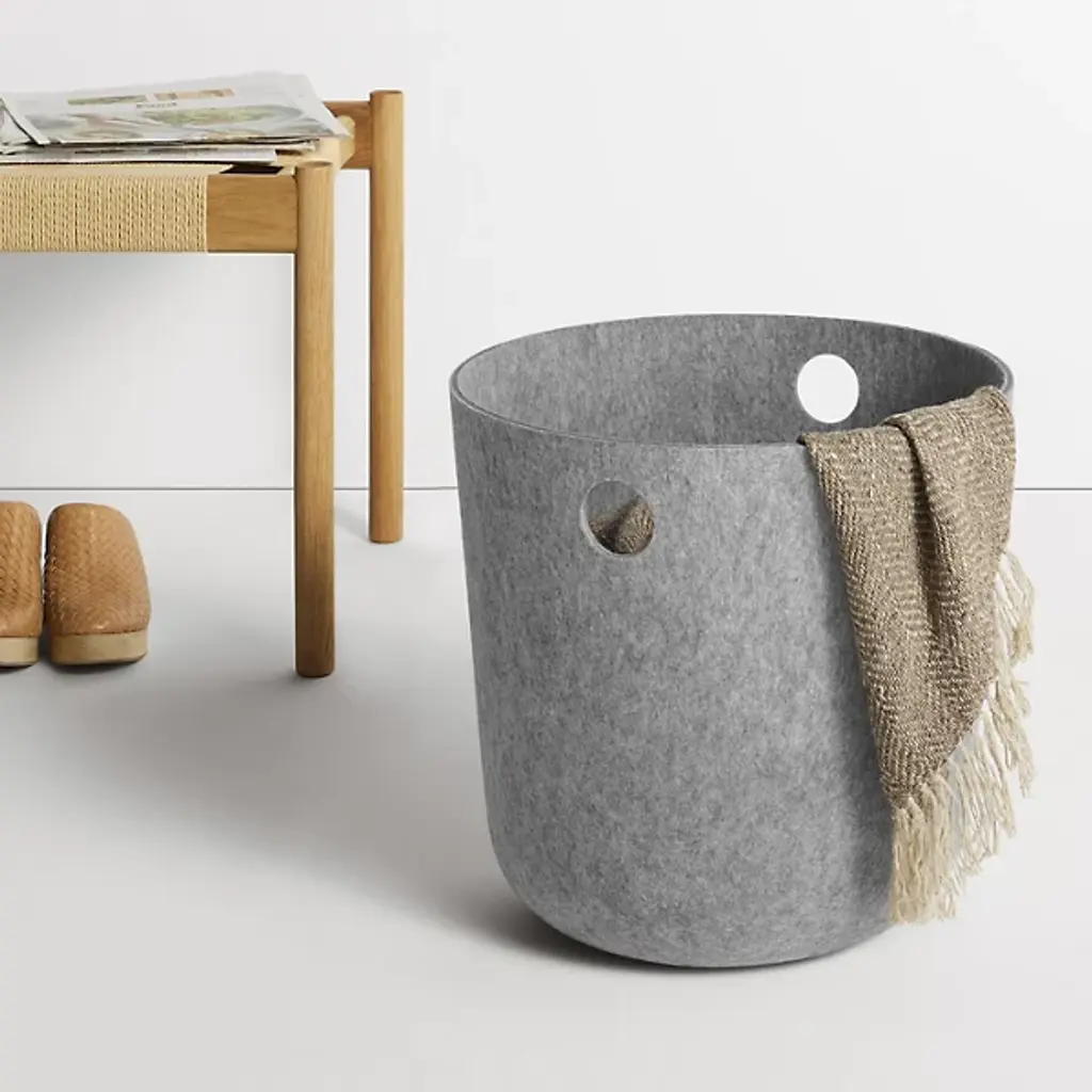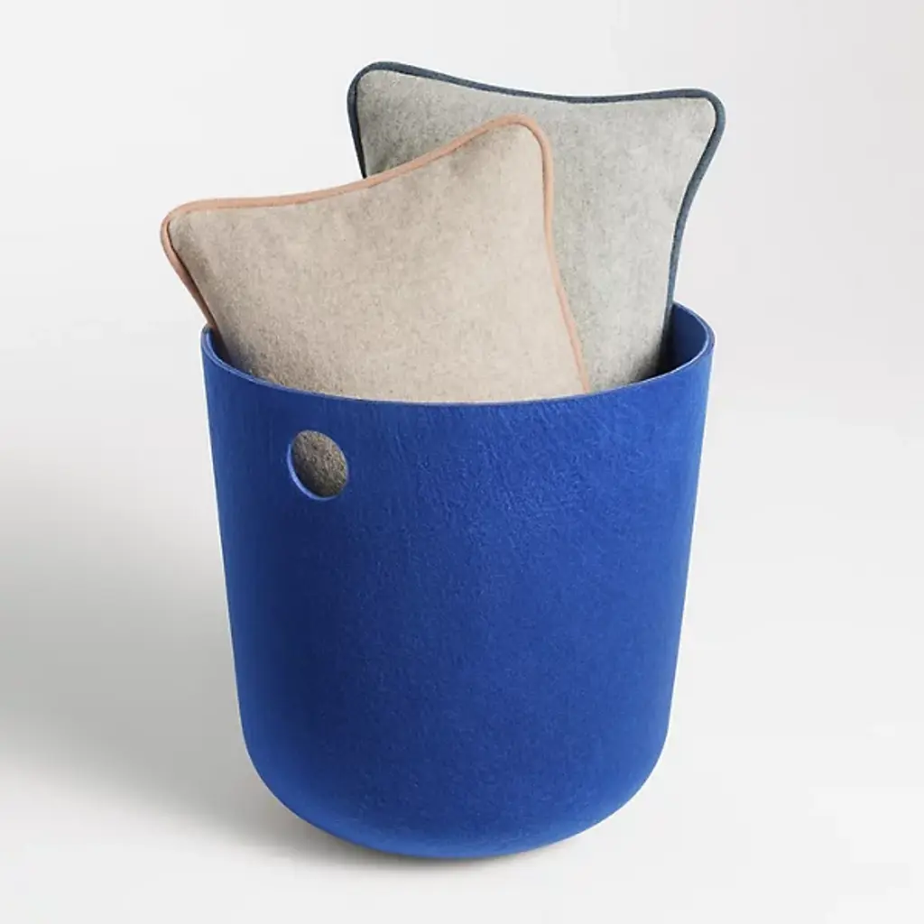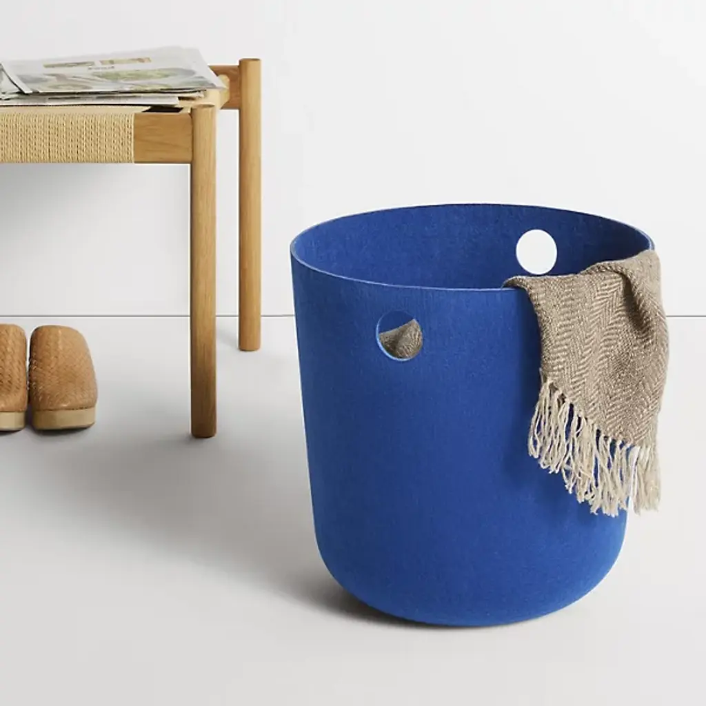 The Olly Storage Basket from Blu Dot utilizes felt panels made from recycled post-consumer polyester to create a sturdy storage solution for household items. This eco-conscious construction process results in natural color variations between panels, making each basket unique. The felt material offers durability while remaining easy to clean with a damp cloth when needed. Perfect for organizing children's rooms, living areas, or entryways, this basket handles everything from toys to blankets with equal efficiency.