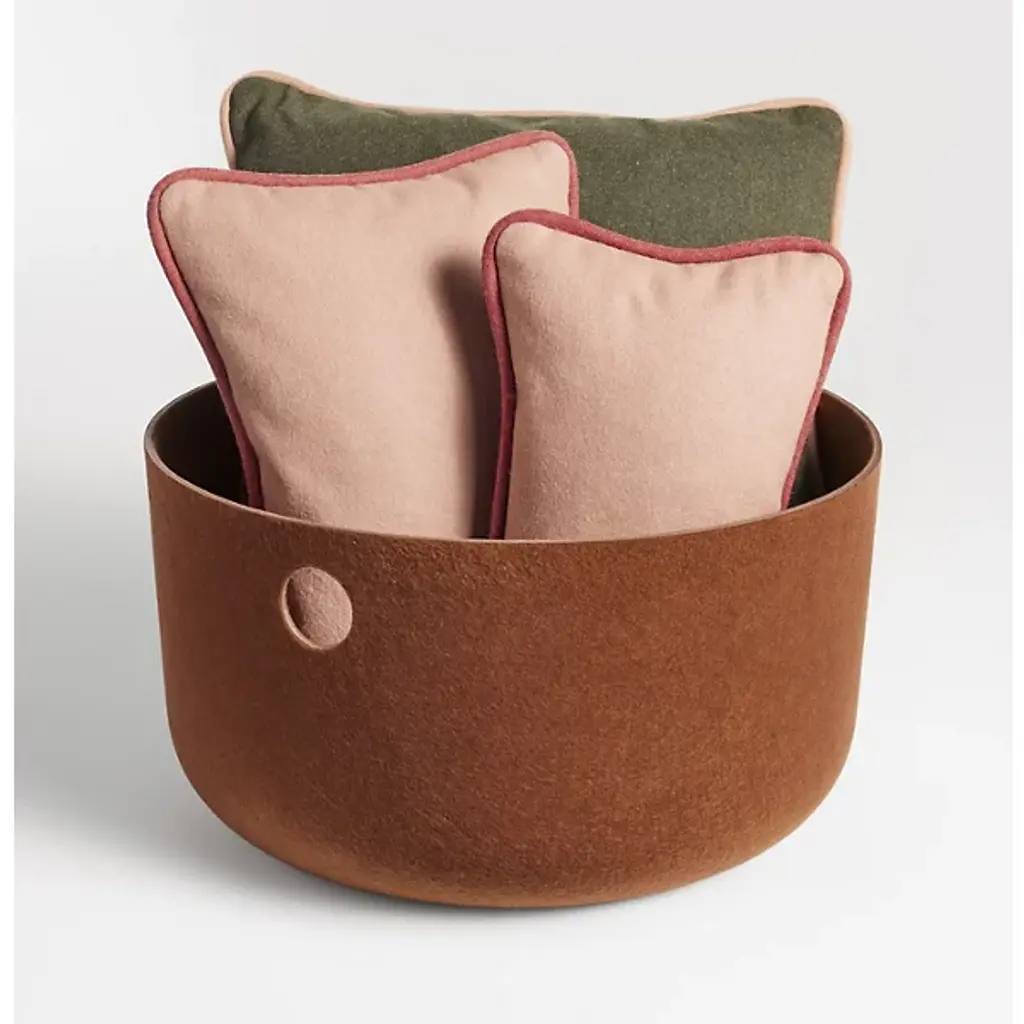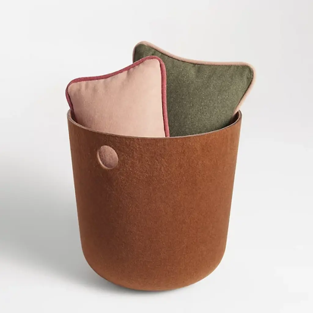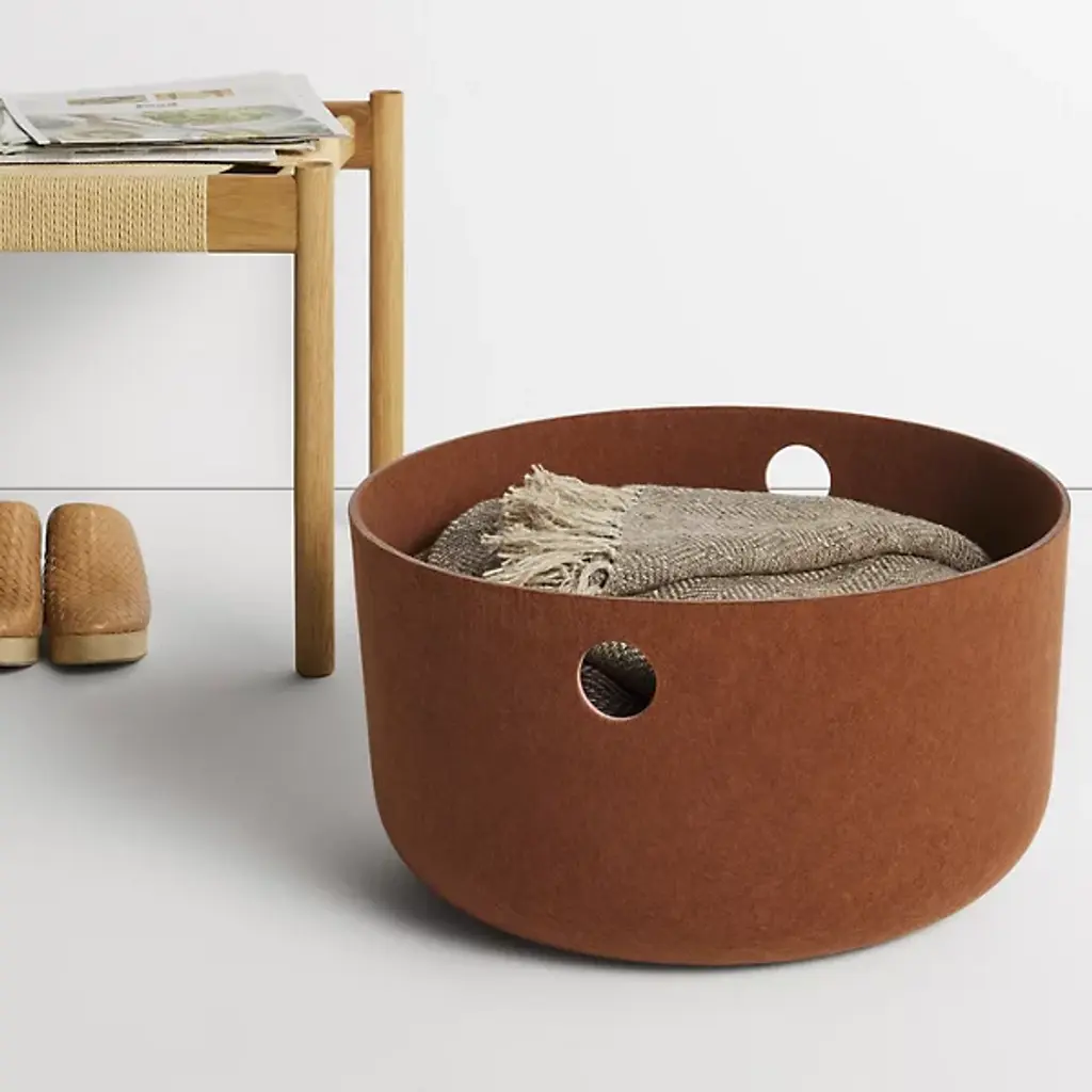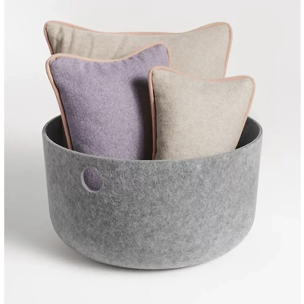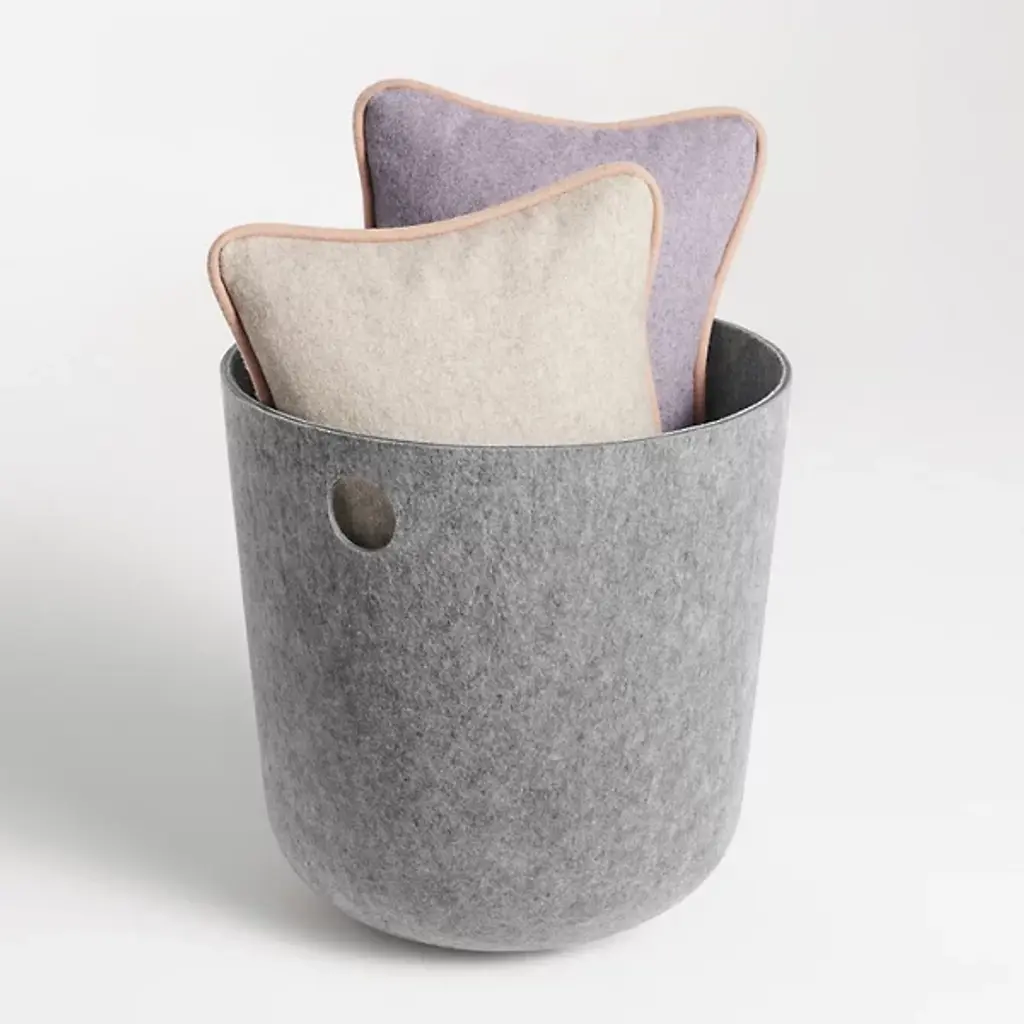 The Olly Storage Basket from Blu Dot utilizes felt panels made from recycled post-consumer polyester to create a sturdy storage solution for household items. This eco-conscious construction process results in natural color variations between panels, making each basket unique. The felt material offers durability while remaining easy to clean with a damp cloth when needed. Perfect for organizing children's rooms, living areas, or entryways, this basket handles everything from toys to blankets with equal efficiency.