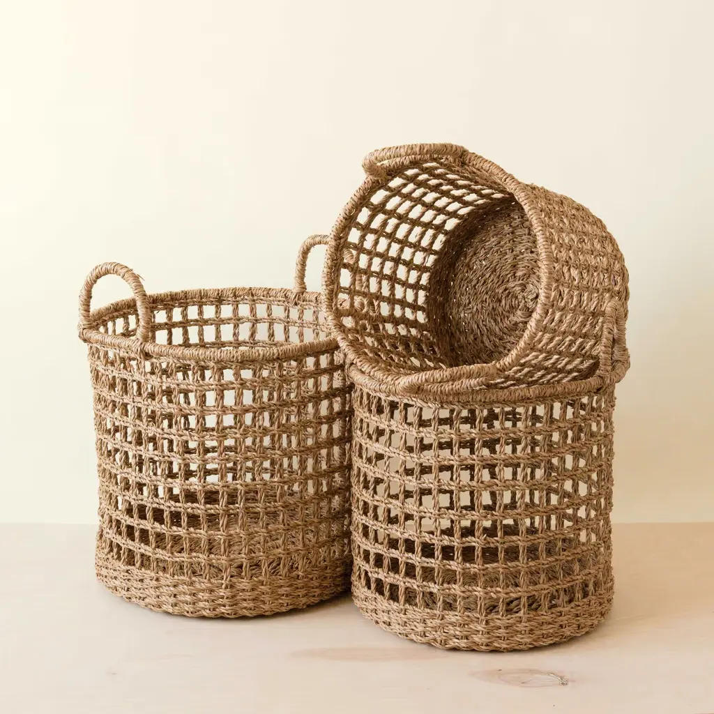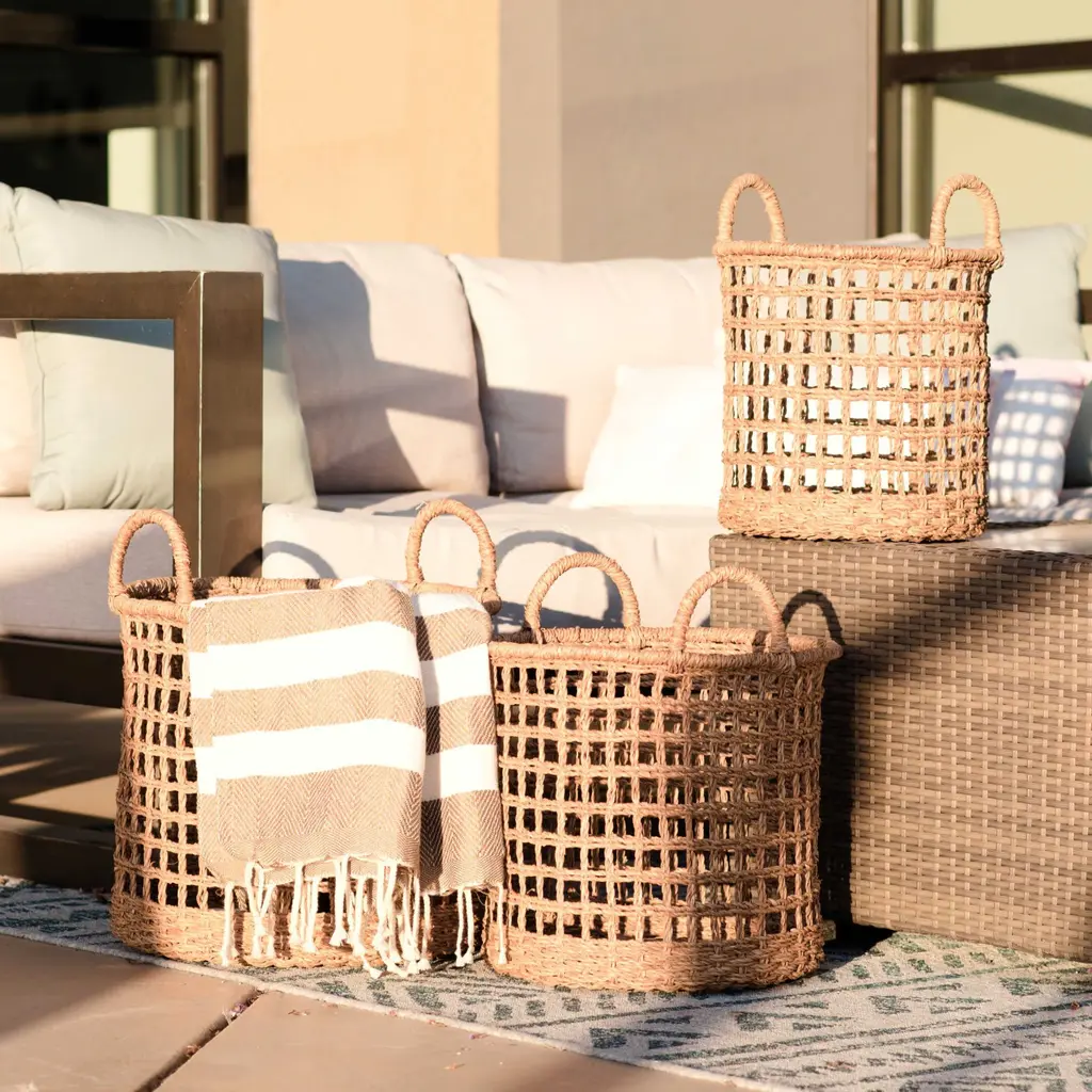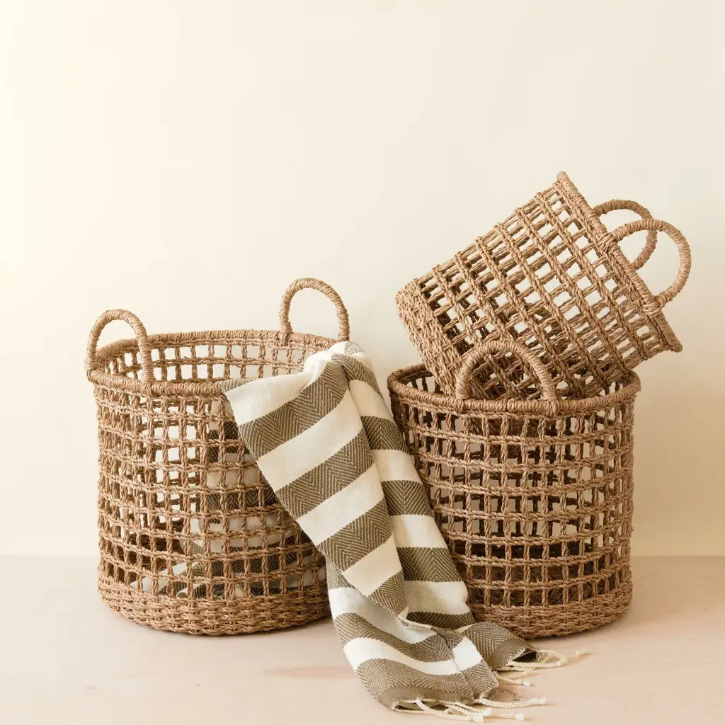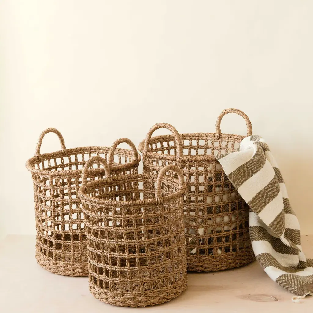 The best things come in threes. A set of beautifully crafted open weave natural seagrass baskets for any modern home. They can be used to store everyday objects or your favorite houseplants. Our all-around handwoven baskets are stylish and functional, adding a natural vibe to just about any room. Each piece is carefully handcrafted by artisans in the Philippines, and made sustainably with seagrass rope. Every purchase goes towards empowering our artisan communities.Since each piece is handwoven, please expect slight variation in design, color, shape, and size.