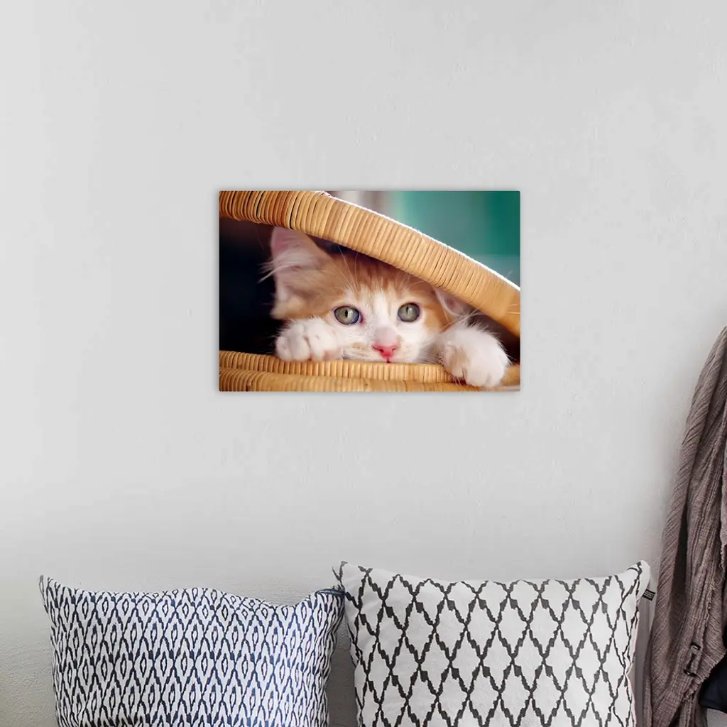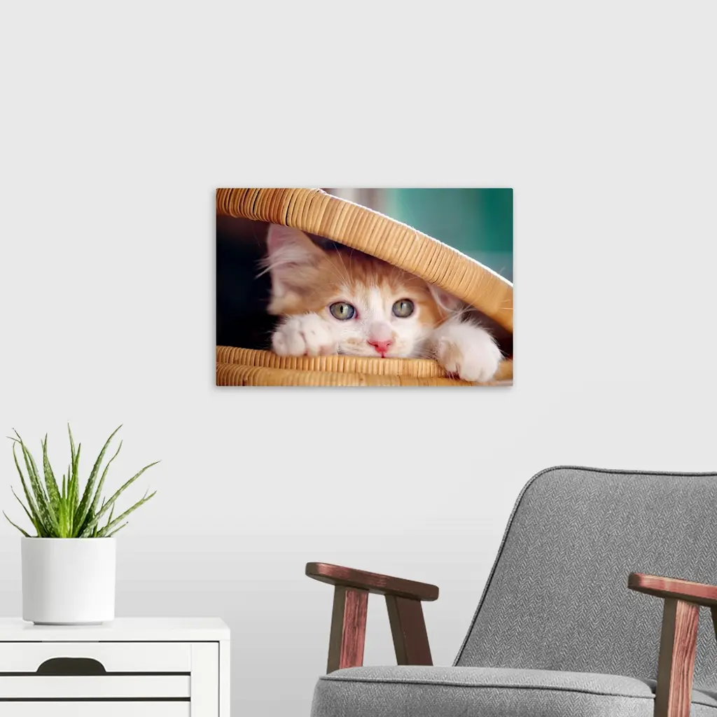 Orange and white kitten in basket. wall art for home and office decor. Discover canvas art prints, photos, mural, big canvas art and framed wall art in GreatBigCanvas.com's varied collections.