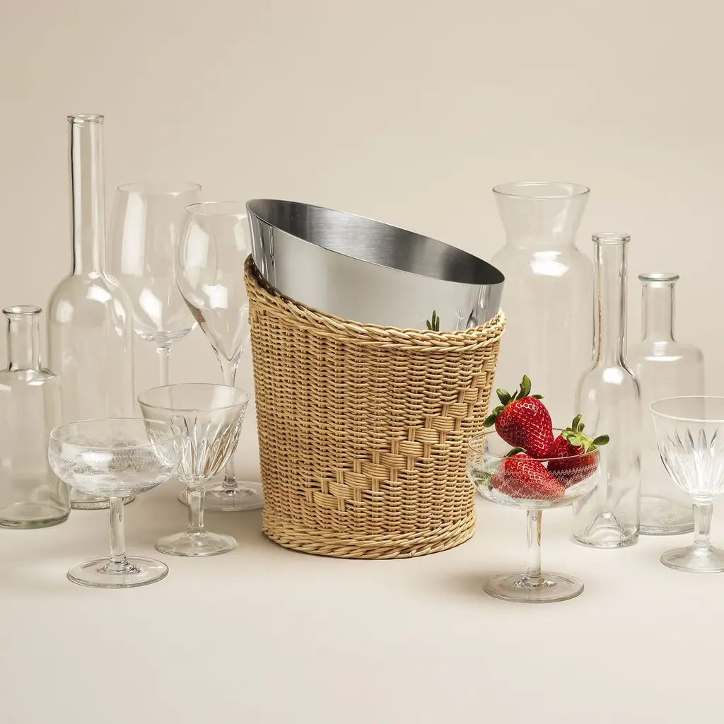 With this exclusive glacette, keeping champagne or wines cool offers an occasion to admire the artisan mastery behind the minute and intricate manual weft of its wicker basket. Fashioned of steel, the glacette features an oblique cut that makes its design harmonious and welcoming, reminiscent of a blooming orchid. A special water-based finish ensures the wicker to maintain its natural beauty.