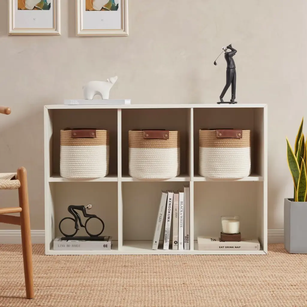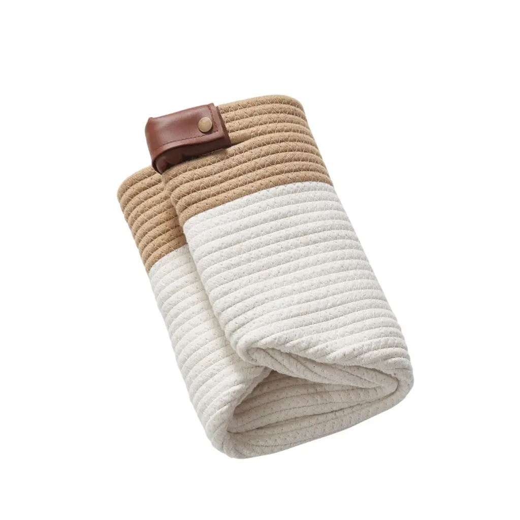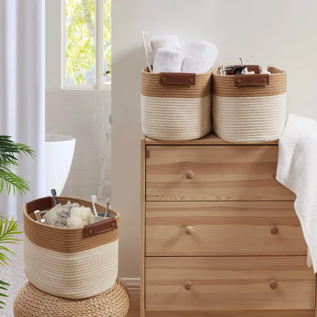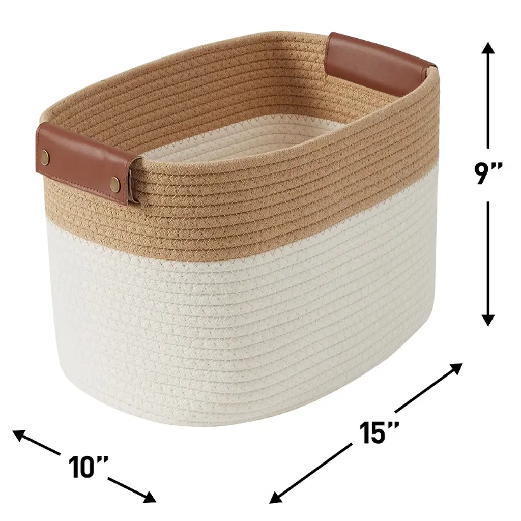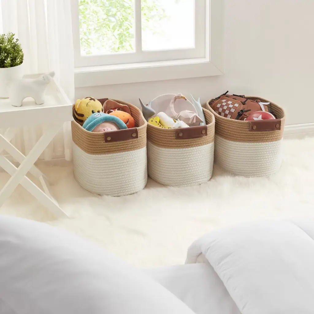 Upgrade your home organization with this 3-Pack Cotton Rope Storage Basket set—designed for both function and style. Perfect for storing books, toys, clothes, linens, and more, these versatile bins offer a simple way to keep your space tidy and clutter-free. Made from durable yet lightweight cotton rope, each basket is sturdy enough to hold larger items while maintaining a soft, decorative look. Faux leather handles add a stylish touch and make lifting, carrying, and accessing items effortless. The baskets arrive folded—no assembly required—just unfold and use instantly. With an easy-to-clean surface, maintaining their fresh appearance is quick and convenient. Whether placed in your living room, bedroom, nursery, or closet, these baskets blend seamlessly into any décor while helping you stay organized in style.
