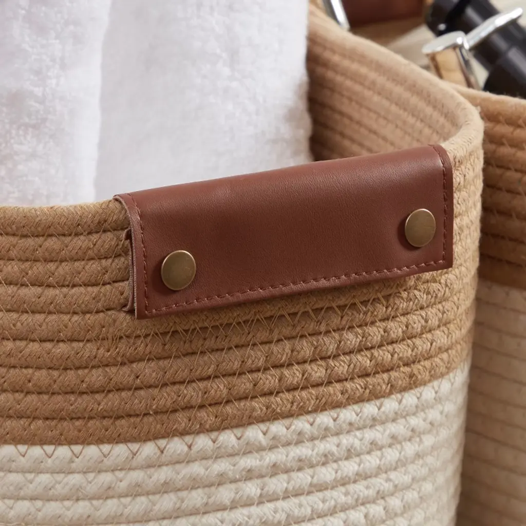 Ornavo Home 3 Pack Cotton Rope Shelf Storage Basket With Faux Leather Handles - Brown/cream