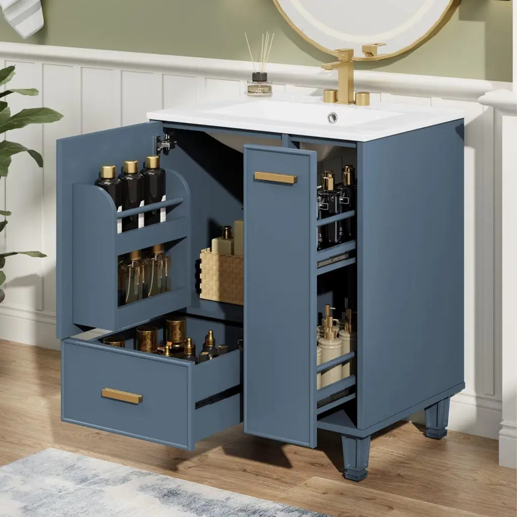 Upgrade your bathroom with the ORRD 24" vanity set, designed for both style and functionality. This compact vanity features a sleek ceramic sink paired with a modern grey cabinet, making it perfect for small bathrooms, apartments, or powder rooms. The smart storage system includes a cabinet with a door shelf, a deep drawer, and a 2-tier pull-out basket, offering plenty of space to keep toiletries and essentials neatly organized. Crafted with a solid wood frame and durable MDF board, it ensures stability and long-lasting use. Delivered in one convenient package, this vanity allows for quick and hassle-free installation, adding a clean and contemporary touch to any bathroom décor.