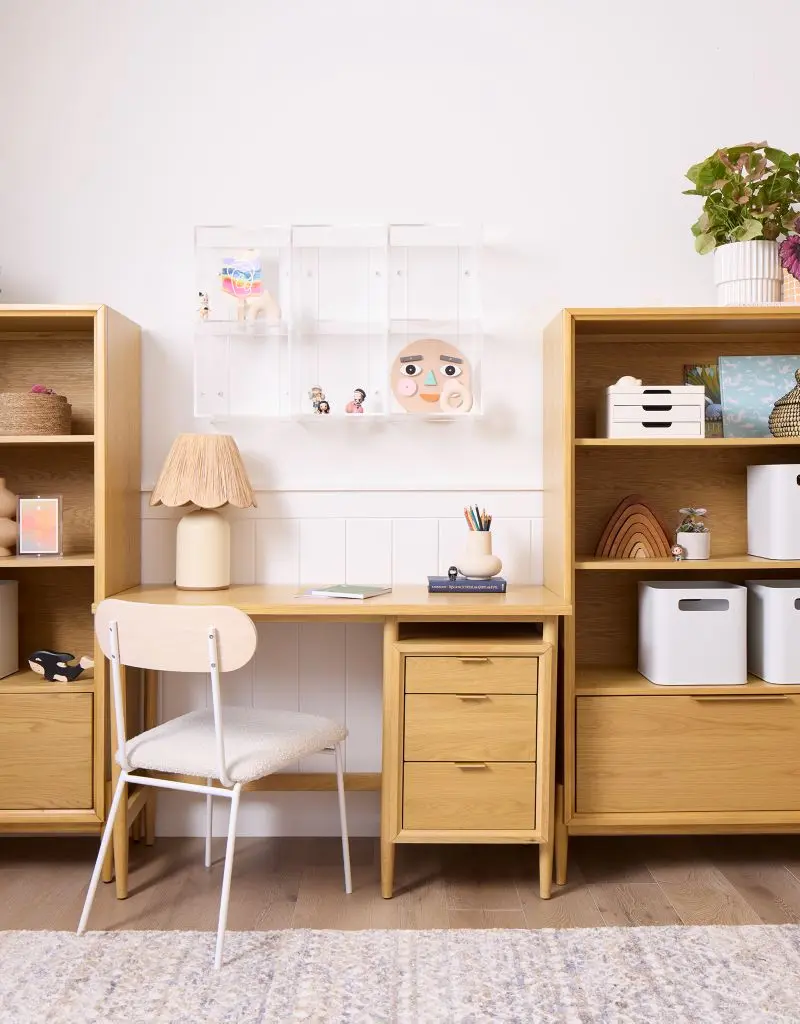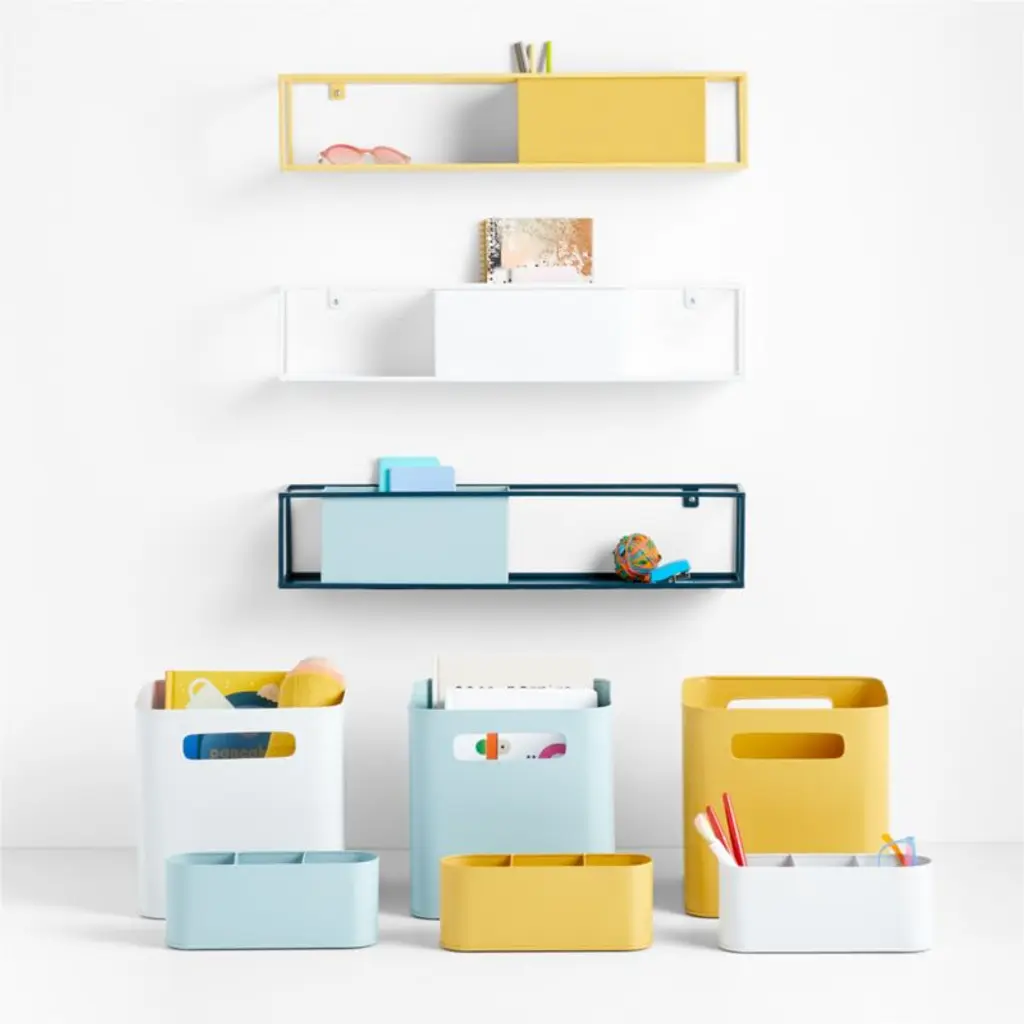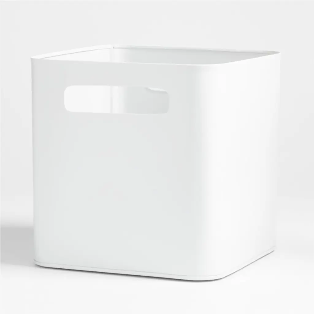 Contain anything and everything with our simple, stylish Outline metal storage bin. Designed for versatility and built to handle years of use, the whiteiron bin is deep enough to keep books upright, craft supplies organized or study essentials always where you need them. The rounded edges look great and slide into a bookshelf cubby or kids desk. Cutout handles on each end are easy for little hands to grip. Pair this bin with the coordinating Outline metal desk organizer and shelf for a study zone dream team.