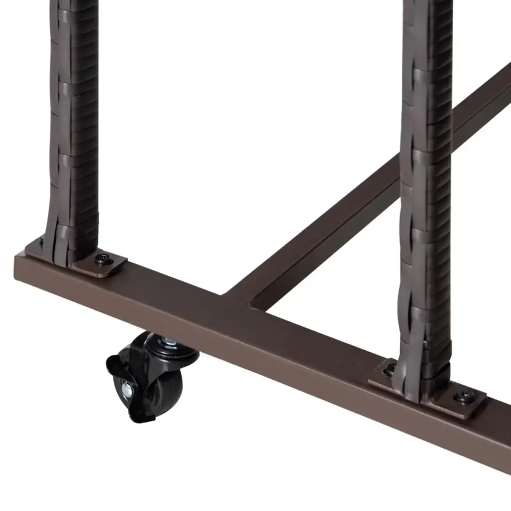 An organizer for indoor or outdoor this rattan storage cart is great for garden tools, pool toys, and more. Placed poolside, down on the deck, or out in the garden, it's a great option for outside. This rattan storage basket is made of handwoven PE rattan wicker and reinforced with a powder-coated steel frame for outdoor use. The organizer features four wheels, two of which are rotating wheels so you can cart off floaties when and where you need them.