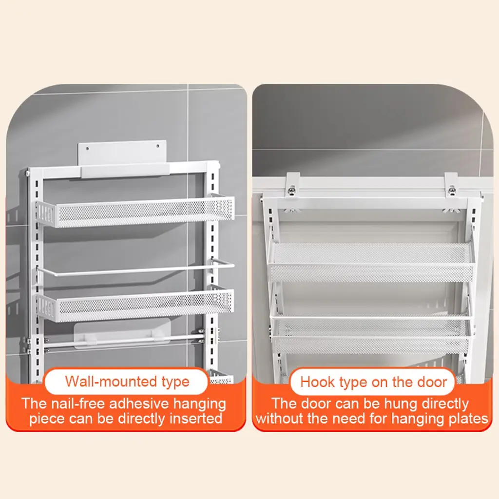 Product DescriptionThickened brackets and reinforced welded joints can withstand 80 pounds. Flexible height adjustment allows large spice jars, drinks, snacks, etc. to be stored well here. In addition, anti-collision bars and adhesive strips are also designed to ensure strong load-bearing capacity. Now we are fully prepared for behind-the-door storage that will last for years.Product informationSize: 17.32 x 6.3 x 49.6 inchesItem Weight: 8.16 poundsMaterial: Alloy SteelColor: WhitePacking List:1 x Hanging bracketNote:Different displays may cause the color of the item in the picture a little different from the real thing.Manual measuring,please allow 1~3mm error,thank you.