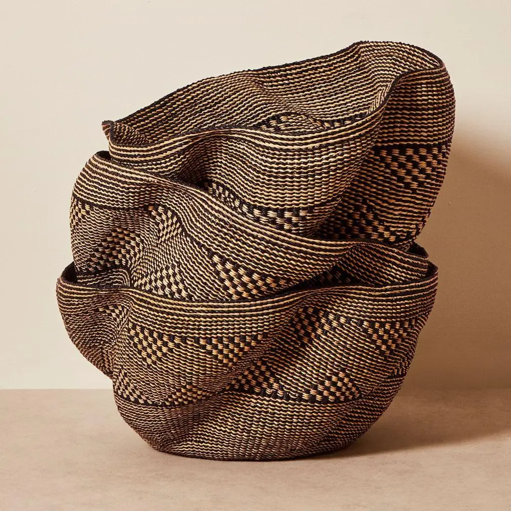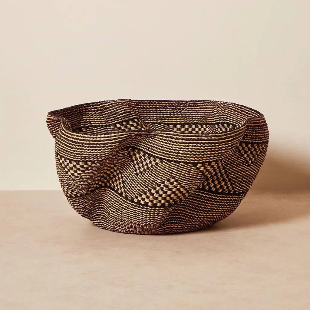 Boasting the intricate patterns, shapes and expert weaving techniques of Baba Tree's Ghanaian artisans, the Pakurigo basket features a wave-like silhouette that few weavers are able to master. Crafted from flexible yet strong elephant grass, the Pakurigo's wide diameter allows for easy storage in your home, from extra blankets near the sofa, to children's toys, or cold-weather accessories tucked conveniently near the entryway. Each basket features a singular design created by its weaver, ranging in colors and patterns from simple neutrals to bright, complex creations.