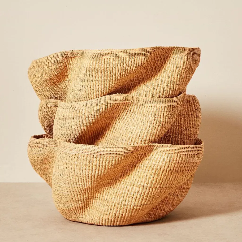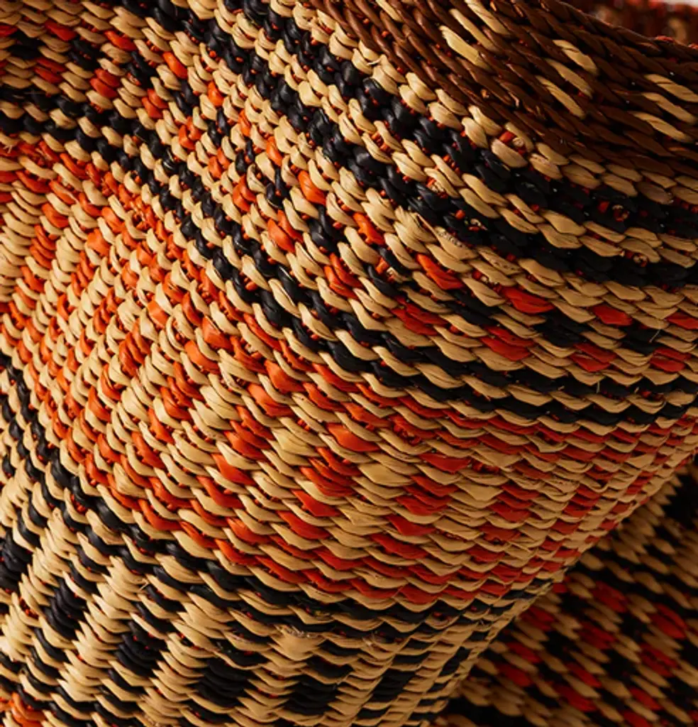 Boasting the intricate patterns, shapes and expert weaving techniques of Baba Tree's Ghanaian artisans, the Pakurigo basket features a wave-like silhouette that few weavers are able to master. Crafted from flexible yet strong elephant grass, the Pakurigo's wide diameter allows for easy storage in your home, from extra blankets near the sofa, to children's toys, or cold-weather accessories tucked conveniently near the entryway. Each basket features a singular design created by its weaver, ranging in colors and patterns from simple neutrals to bright, complex creations.