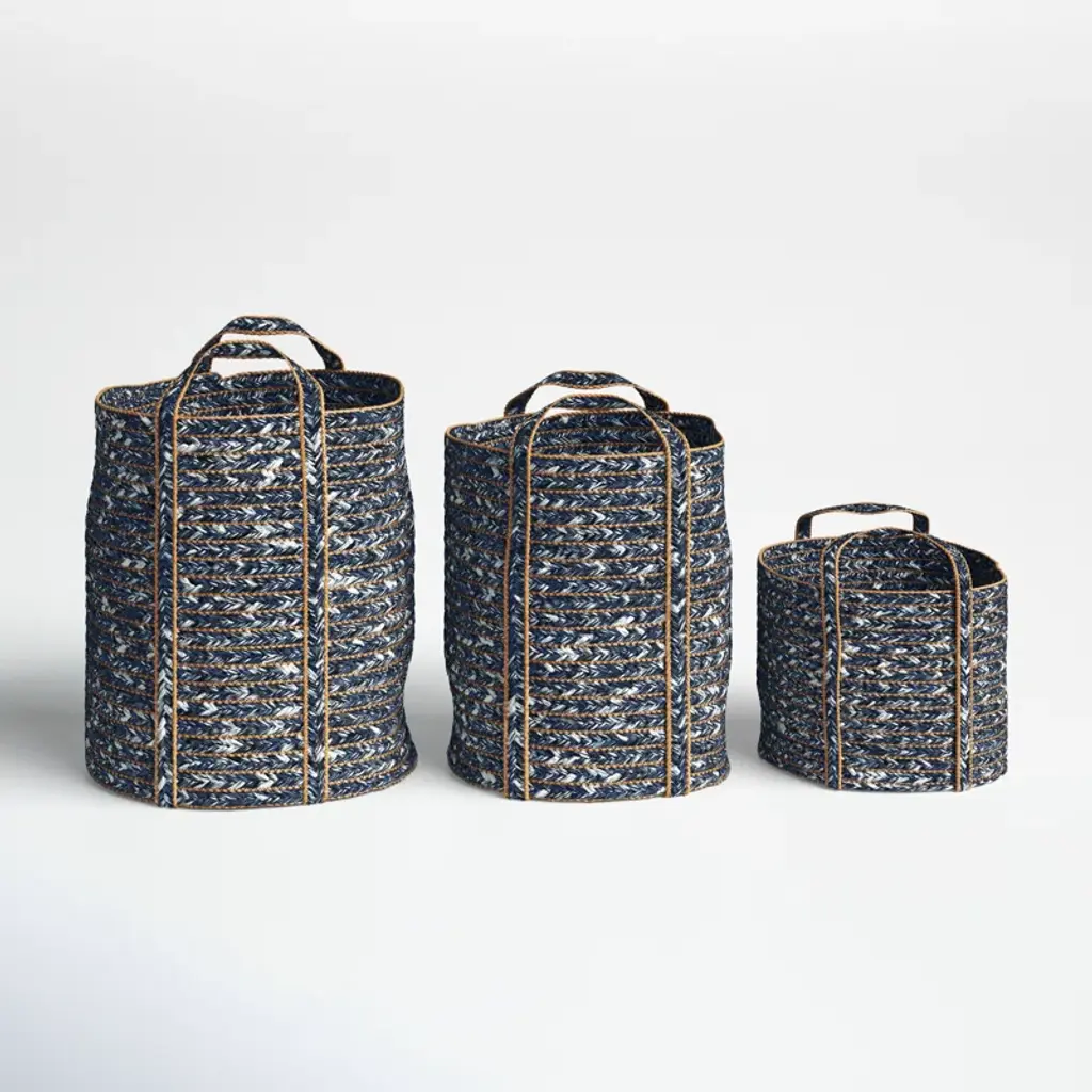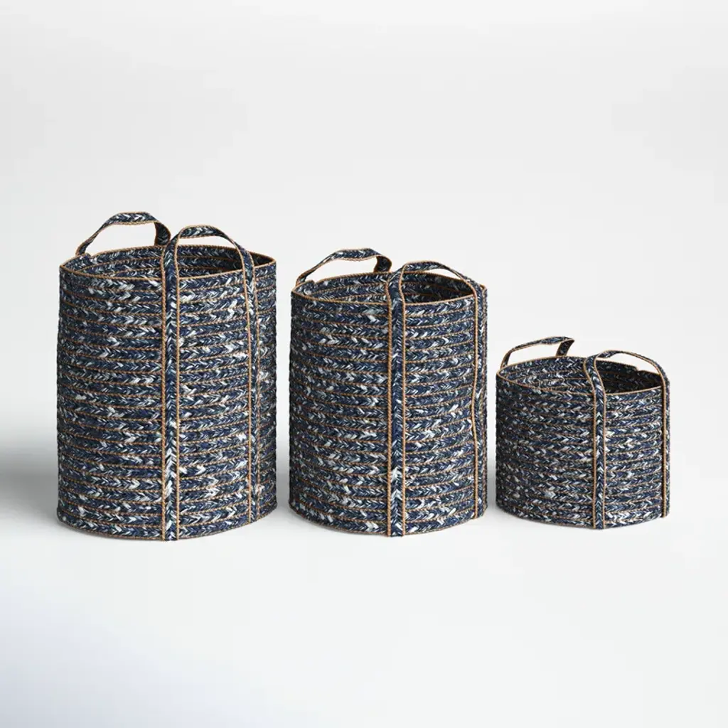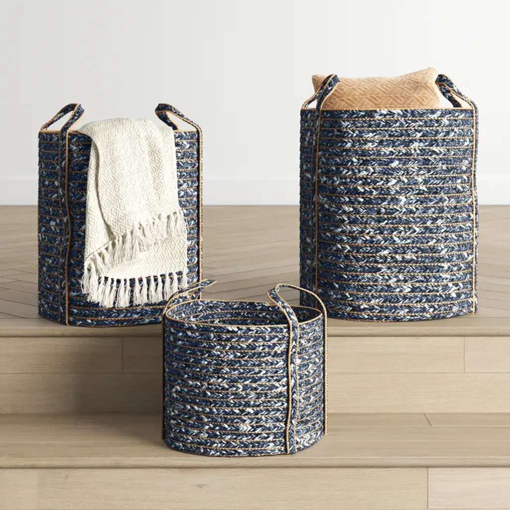 In a deep blue and natural hue, this set of baskets don't just add storage, they also add a pop of color and rich texture to any space. Great for towels, toys, or anything needing to be tucked away.