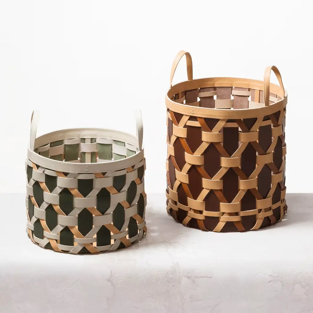 A refined and stylish alternative to the classic woven basket, this exceptional design is entirely handcrafted of braided saddle leather combining a natural tone with loden green and light gray. Designed by Federica Biasi, it is completed with practical handles and enriched with tone-on-tone stitchings. Available in all the colors from the Rabitti 1969 color chart: white, light grey, mud, graphite, black, mocha, brown, cognac, natural, cream, yellow, mango, red, navy blue, and loden green.