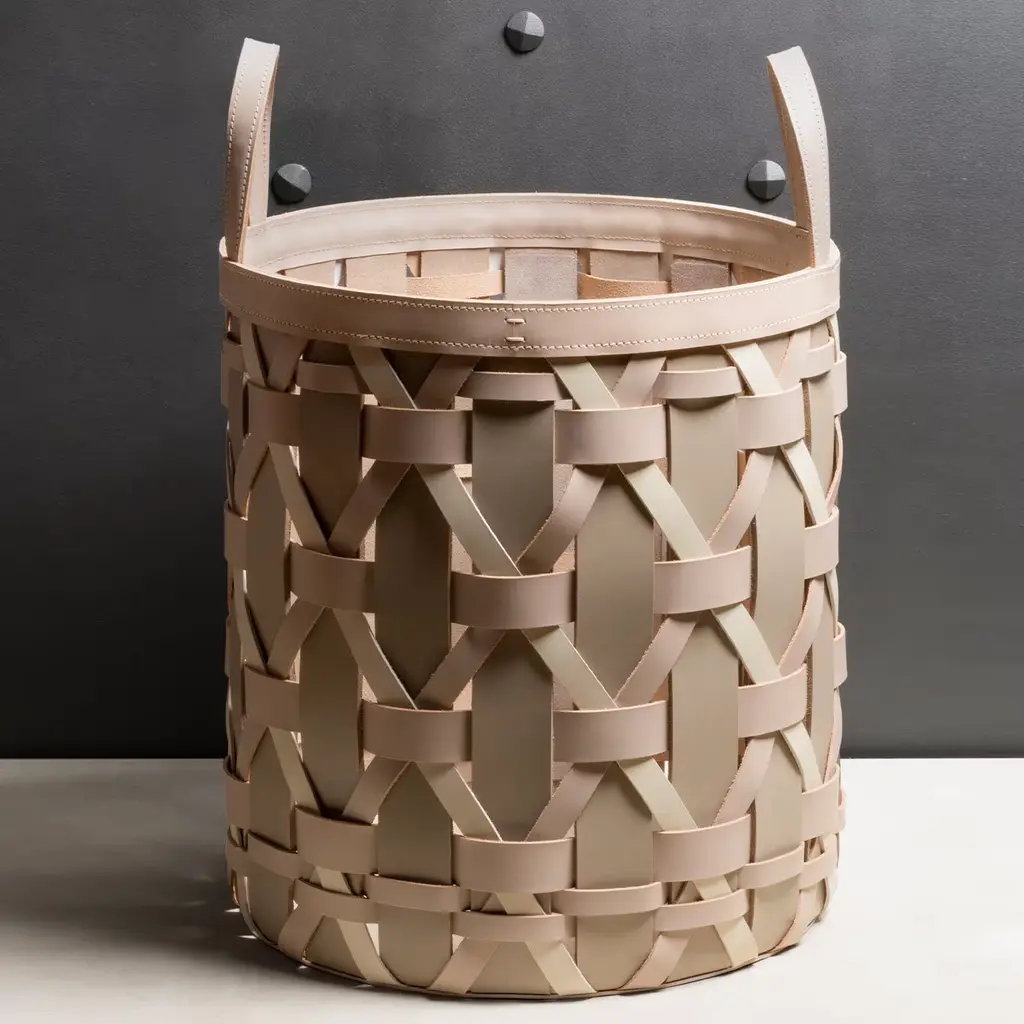 Exuding timeless charm and subtle sophistication, this exquisite design by Federica Biasi is a stylish and modern interpretation of the traditional woven basket completing a bathroom or living room decor. Handcrafted of braided saddle leathers in cream, light gray, and mud, it features a tall and capacious shape with handles. Available in all Rabitti 1969 tones: white, light grey, mud, graphite, black, mocha, brown, cognac, natural, cream, yellow, mango, red, navy blue, and loden green