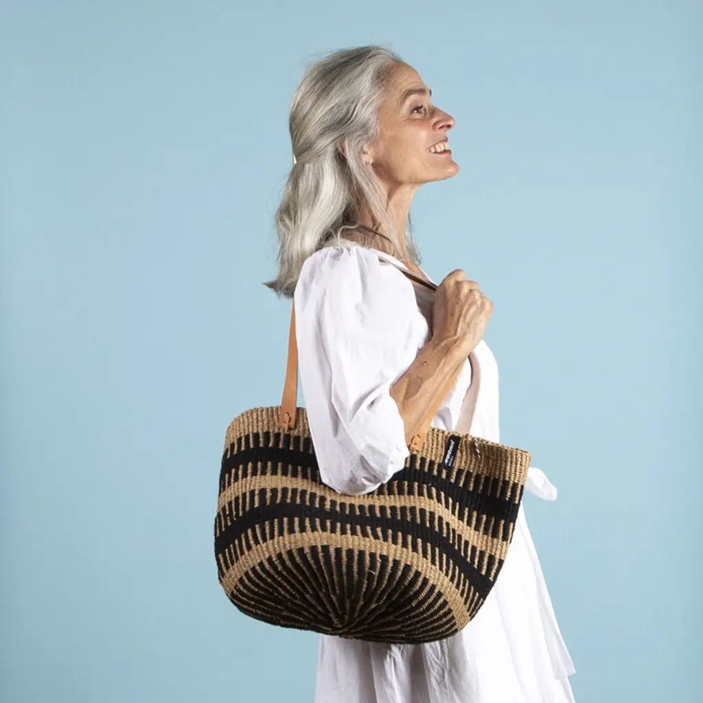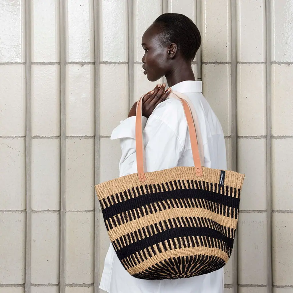 Mifuko's Pamba shopper basket combines two natural materials: wool and paper twine. This unique blend makes the basket soft and flexible, with an earthy, two-tone pattern adding character to its textured surface. Designed to be worn comfortably over the shoulder, the shopper basket is perfect for shopping trips and roomy enough to carry summer picnic essentials or beach gear. Long leather straps add a stylish and practical finishing touch. Each Mifuko basket is handcrafted in Kenya and personally signed by its maker.