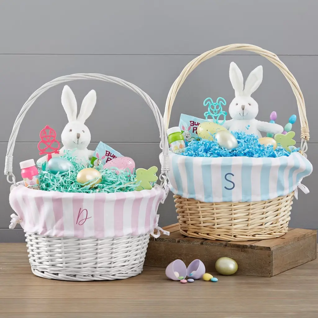 Delight your child this Easter with our Delicate Stripes Natural Easter Basket with Folding Handle. This beautiful, hand-woven basket comes in a natural color and measures approximately 17"-19" H x 12" D with the handle. Each basket is unique, with slight variations in color and size, adding to its charm. The basket is not just functional but also adorable and can be cherished for many years. It comes with white metal hinges on each side of the handle for easy storage. Please note that the handle does not stand up on its own. The standout feature of this basket is the removable liner. The liner includes a tie closure and can be spot cleaned for convenience. This personalized Easter basket is perfect for filling with Easter basket stuffers, making it an ideal gift for your little one. Please note that the basket content is not included. Whether it's a baby's first Easter or a fun surprise for an older child, this personalized Easter basket is sure to make their day extra special.