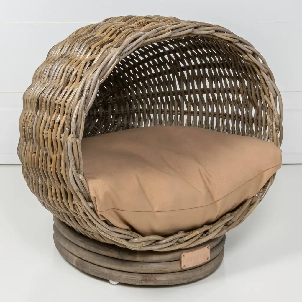 Redefine elegance with our Rancher's Cove Baskets, a sophisticated addition to your home that transcends traditional pet beds and storage solutions. Available in both large and small sizes, these floor baskets combine stylish design with practical functionality.The Small Rancher's Cove Basket is perfect for discerning pet owners or as a chic storage option for cushions and throws. Its elegantly contoured shape adds a touch of grace to any space, seamlessly blending with your decor while providing a cosy retreat for small pets. (5.5KG/ 12lbs max suggested).The Large Rancher's Cove Basket offers a refined solution for more substantial needs. Ideal for medium to large pets or as a stylish container for blankets and throws, its sophisticated design makes it a standout piece in any room. This basket exudes luxury and functionality, making it an impeccable choice for both storage and decor. (25KG/ 55 lbs max suggested)Each Basket ships with a complimentary Organic Cotton J'Jute Shopping Tote. Material: 100% Natural Handwoven RattanColour: Natural Small: 44cm High x 62cm DiameterPlease, note that interior cushions are not included. While wicker is a robust material, it is best suited for gentle use and J'Jute cannot be liable for damage caused by pets. Jagger the Toy poodle is 3.5kgDue to the handcrafted and natural nature of J'Jute's products, sizes may vary slightly.