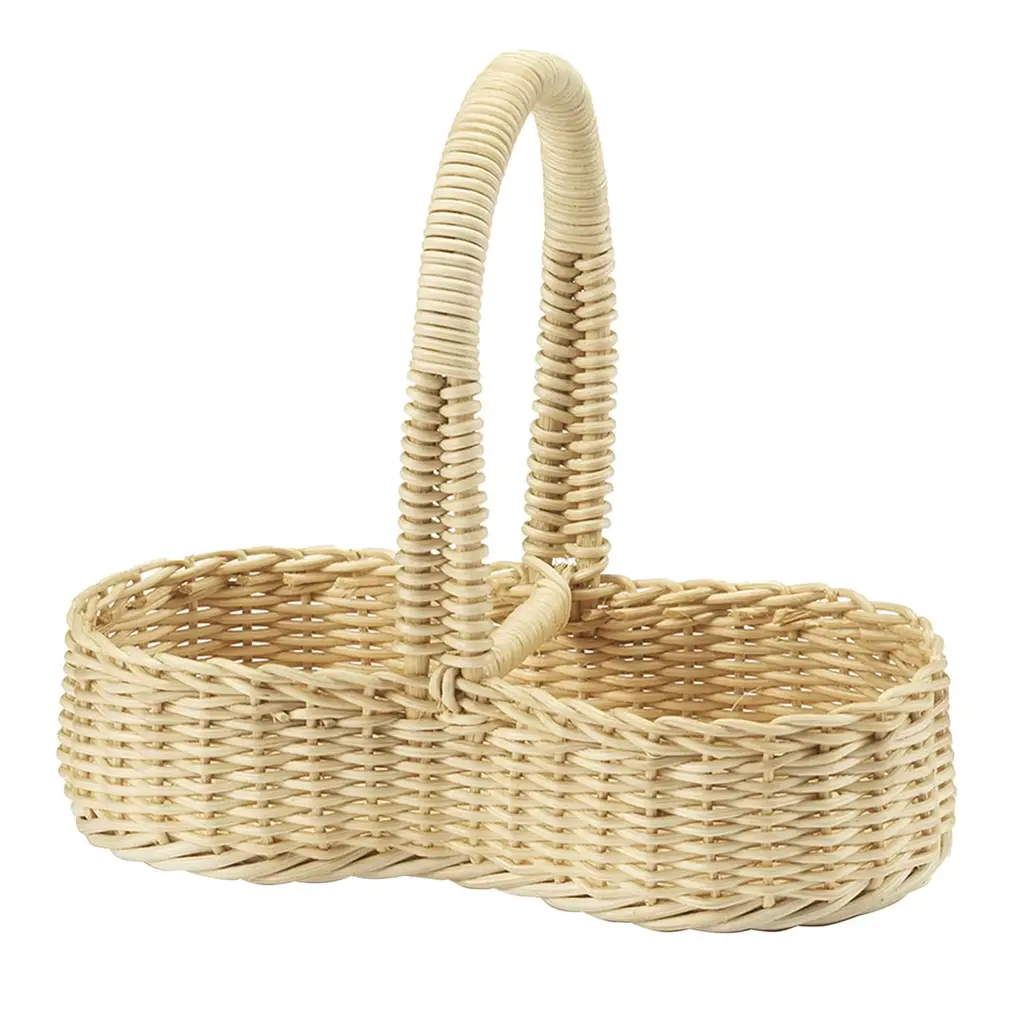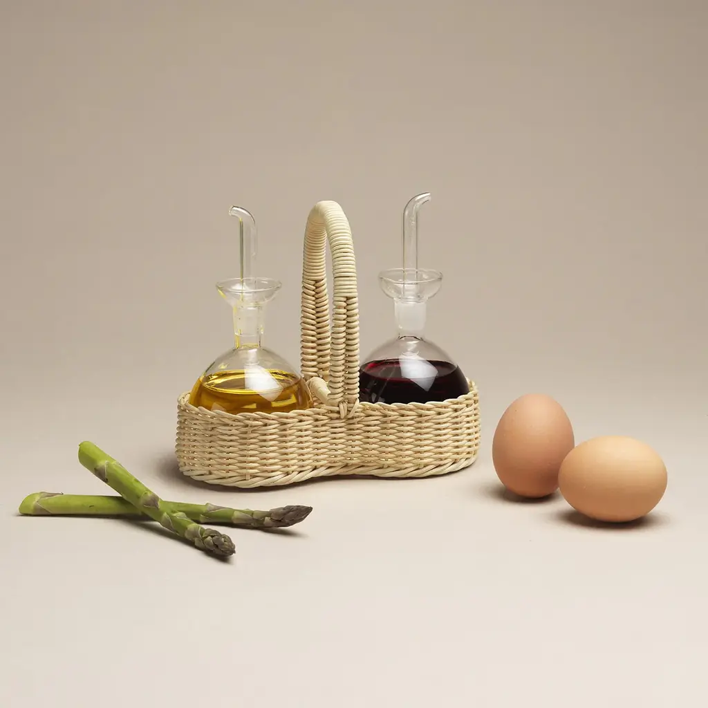 Decades of artisan weaving tradition are encapsulated in this exquisite cruet set. Two glass cruets - ideal to contain olive oil and vinegar - are welcomed in specific slots obtained from impeccable reed wefts crafted exclusively by hand. Completed by a simple curved handle for easy carriage, the design features a special water-based finish ensuring the wicker's natural beauty remains untouched over time. Two glass cruets included.