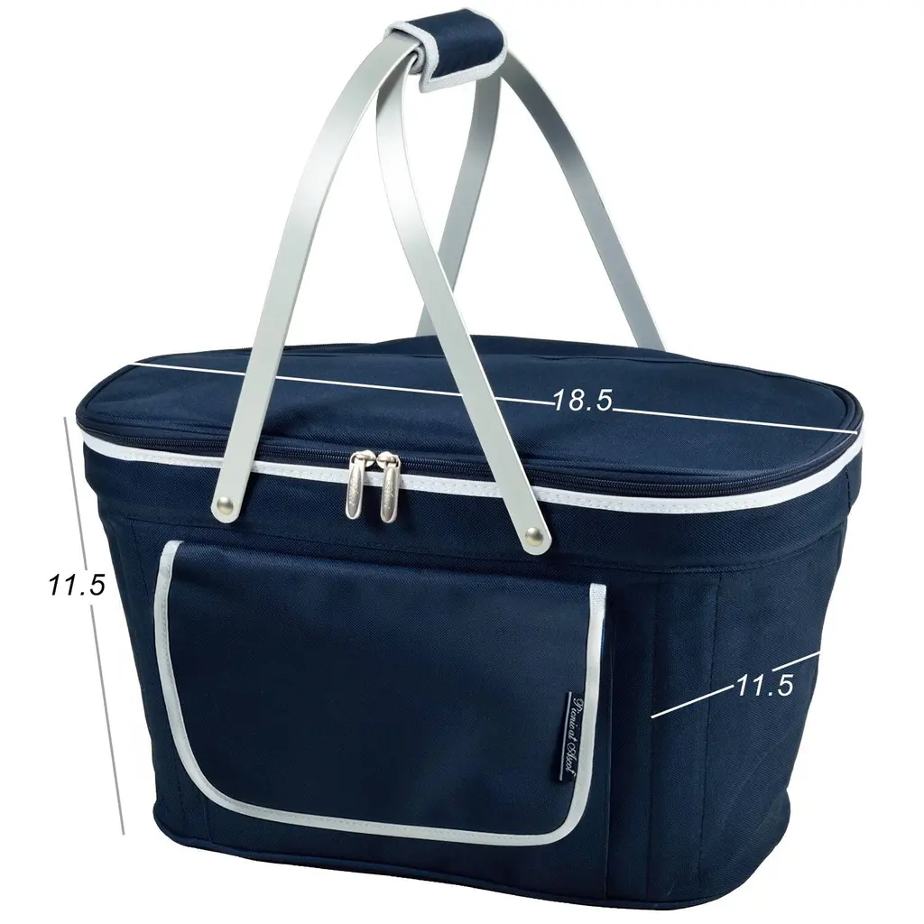 This elegantly designed market basket picnic tote from our Diamond Collection, is Thermal Shield insulated, to keep food and drinks at the perfect temperature for hours. Constructed with a sewn in lightweight aluminum frame and handles, it has a heat sealed leak proof food safe lining. Aluminum swivel handles, padded hand grip, front pocket, and fully zippered top. This unique cooler Folds flat for storage and has permanent built in side supports (no installation required) to hold empty cooler upright for easy loading. Patent Pending. Designed in the USA. Lifetime warranty.