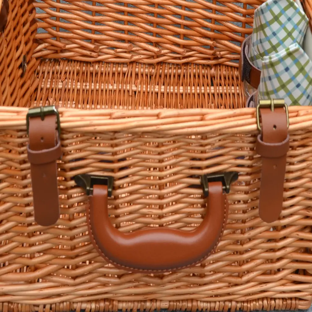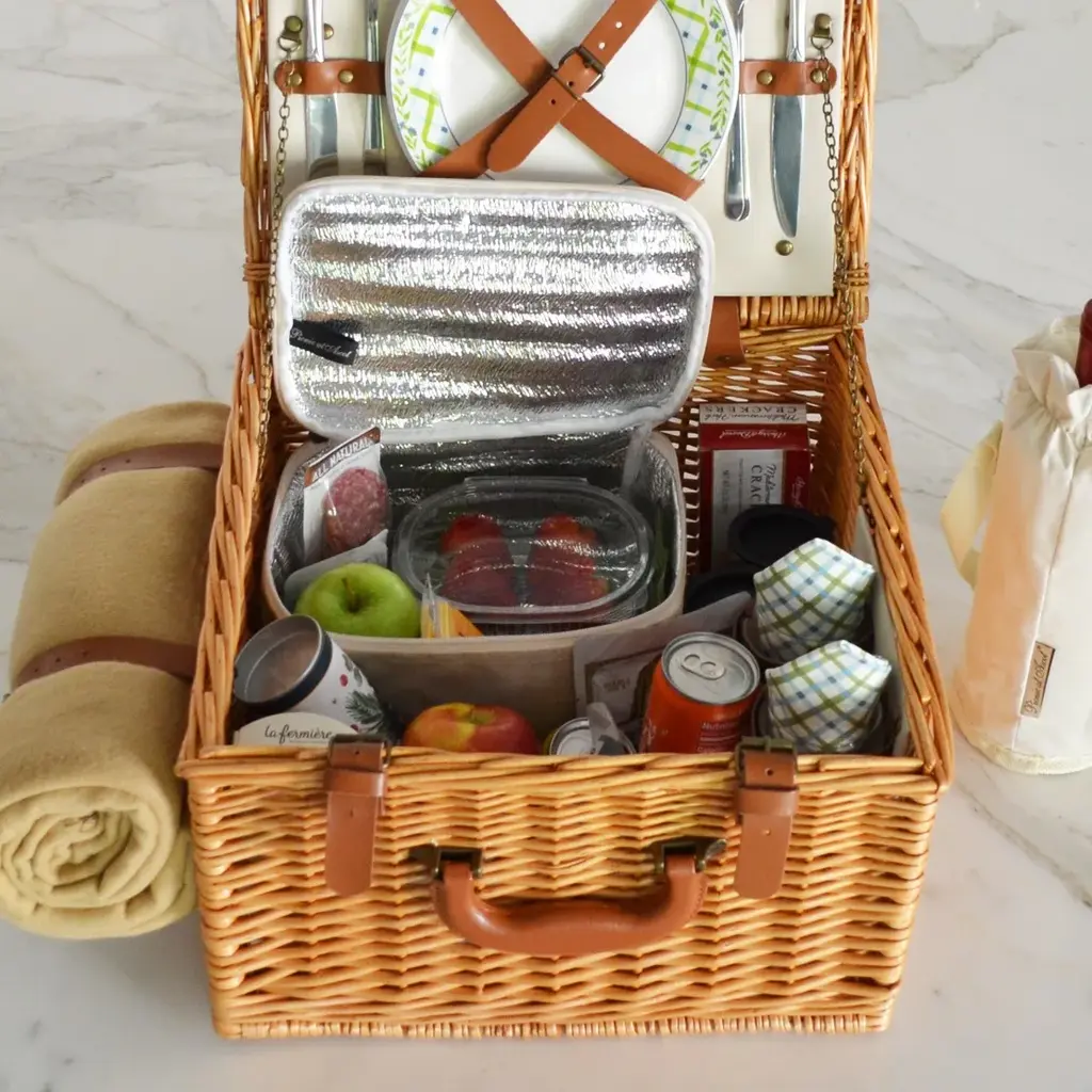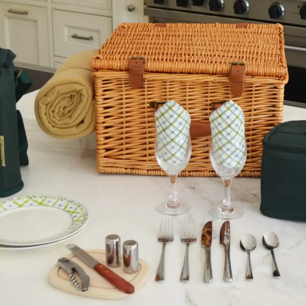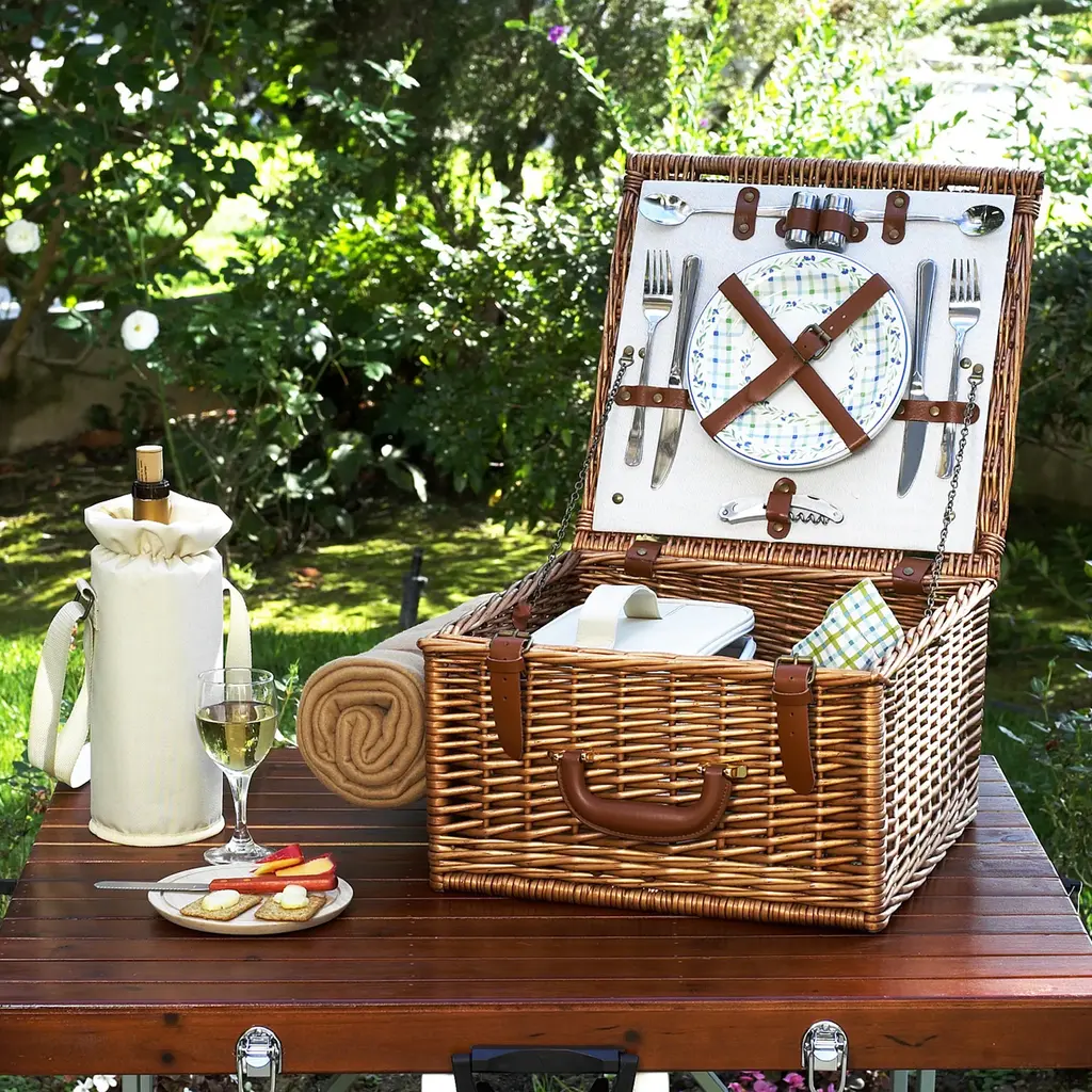 The quality and sophistication of the English style Cheshire Picnic Basket for two is sure to impress. Beautifully hand crafted using full reed willow, each basket includes ceramic plates, glass wine glasses, and the highest quality accessories. Includes: (2) ceramic plates, glass wine glasses, stainless flatware, cotton napkins, (1) food cooler, insulated wine pouch, hardwood cutting board, spill proof salt & pepper shakers, wood handle cheese knife, stainless waiters corkscrew, and 50" x 60" fleece blanket. Natural Willow with leather handle, closures, hinge covers. Lifetime Warranty.