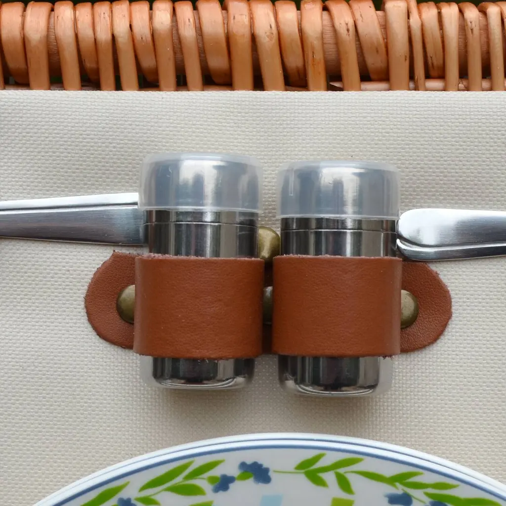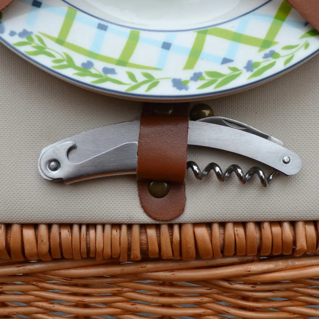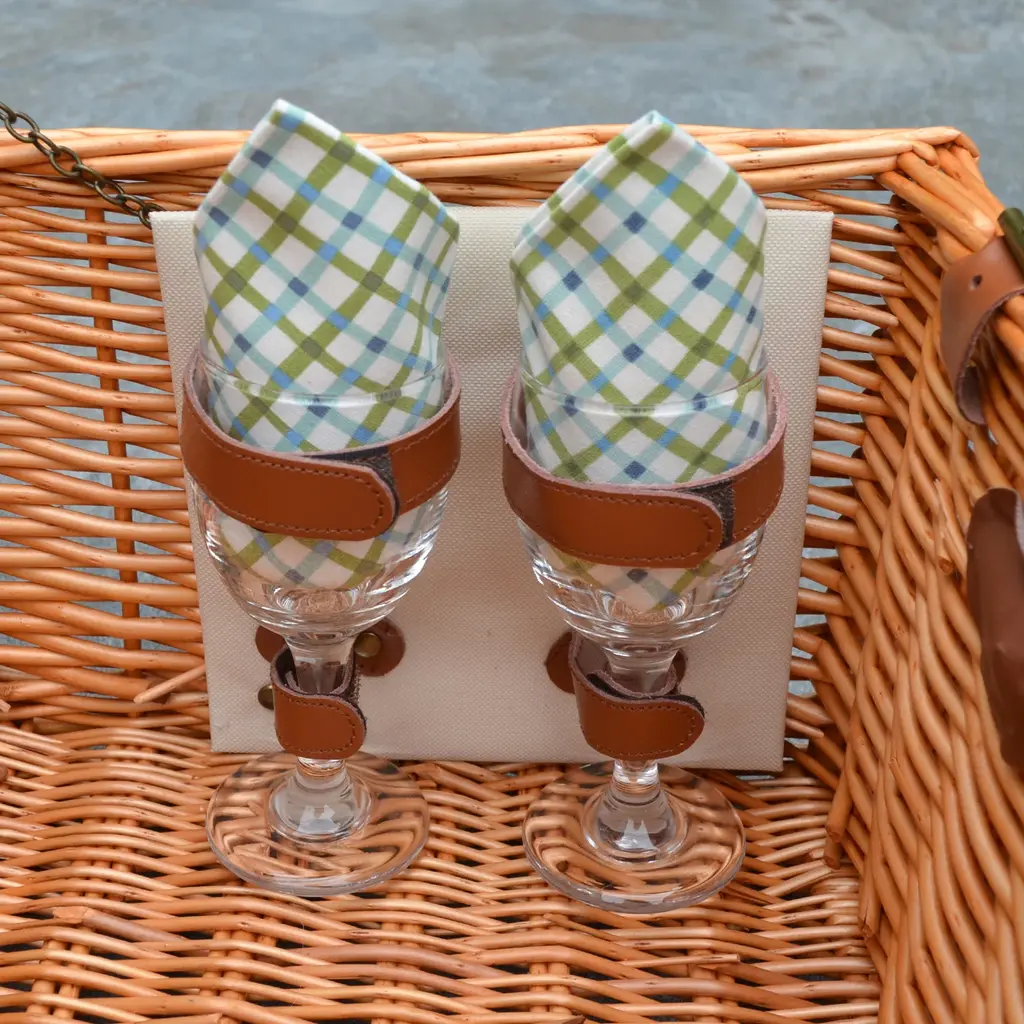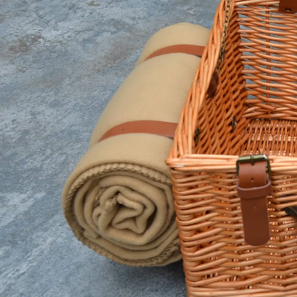The quality and sophistication of the English style Cheshire Picnic Basket for two is sure to impress. Beautifully hand crafted using full reed willow, each basket includes ceramic plates, glass wine glasses, and the highest quality accessories. Includes: (2) ceramic plates, glass wine glasses, stainless flatware, cotton napkins, (1) food cooler, insulated wine pouch, hardwood cutting board, spill proof salt & pepper shakers, wood handle cheese knife, stainless waiters corkscrew, and 50" x 60" fleece blanket. Natural Willow with leather handle, closures, hinge covers. Lifetime Warranty.