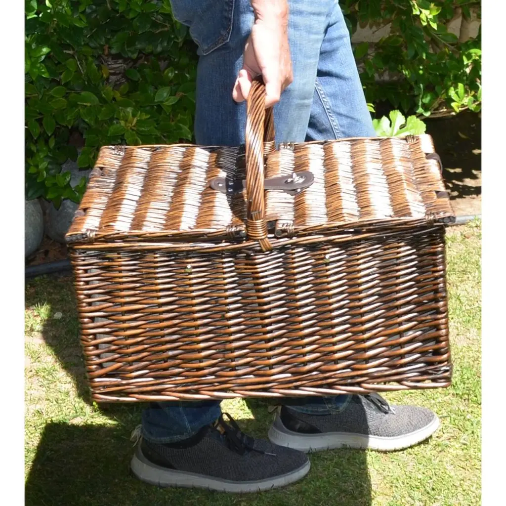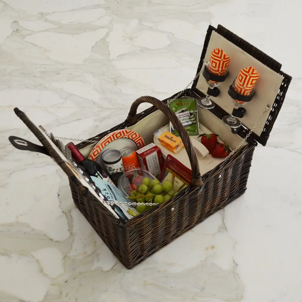 Traditional full reed willow handcrafted basket equipped for 2 with a rich brown finish. It has a traditional picnic basket shape and convenient top carry handle. This set includes coordinating melamine plates and cotton napkins, glass wine glasses, stainless steel flatware, and corkscrew. Also includes a convenient food cooler.