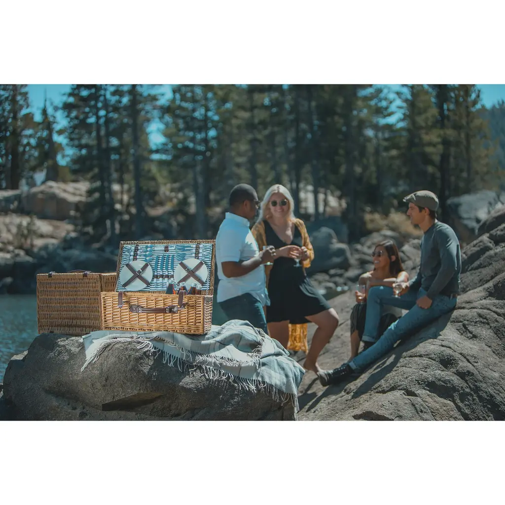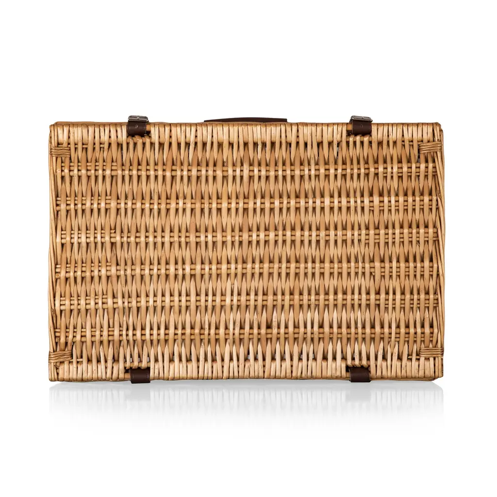 The Belmont Picnic Basket for 4 is a deluxe wicker English picnic basket set loaded with full wine and cheese picnic service for four and plenty of romantic vintage charm. Features:Care Instructions: Surface wash with a damp cloth only. Spot clean. Do not immerse in water. Dry immediately.
