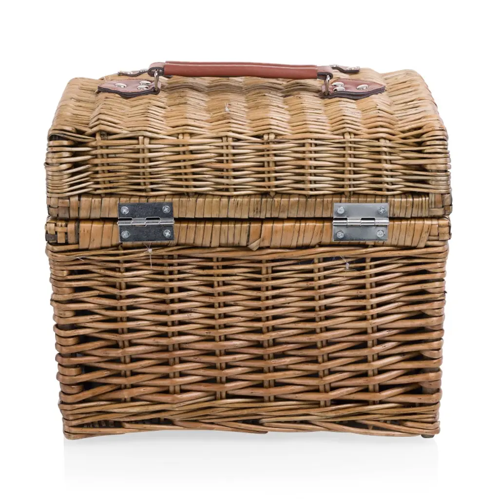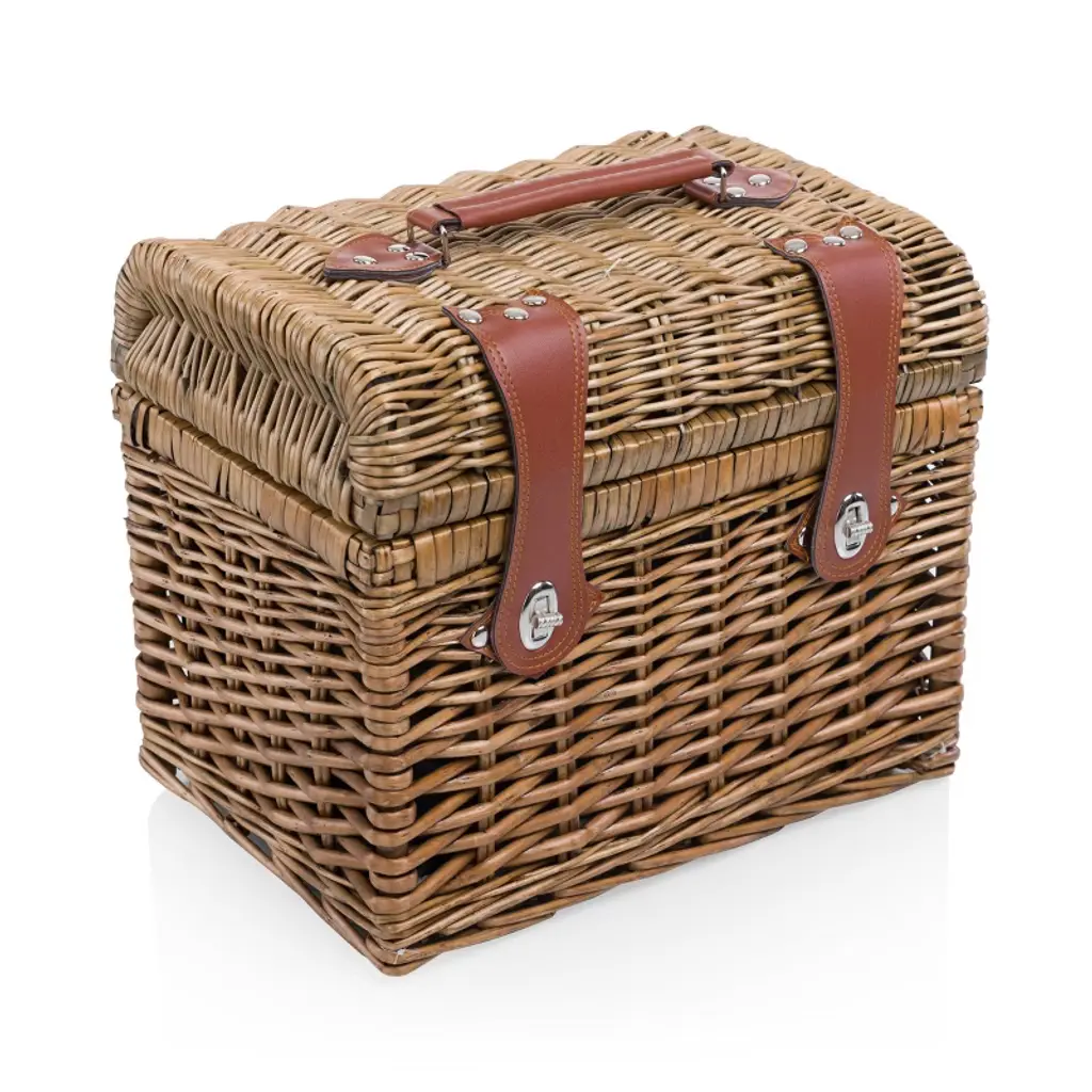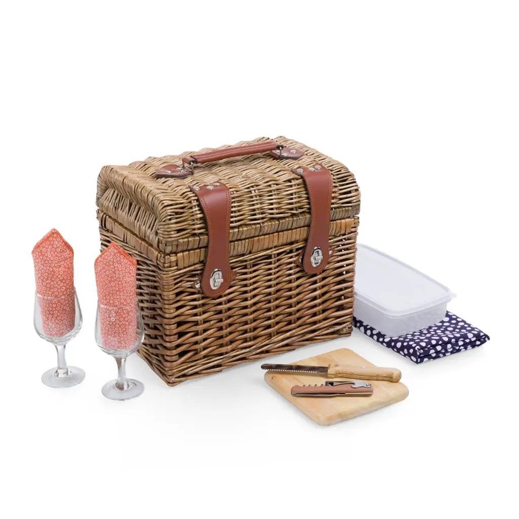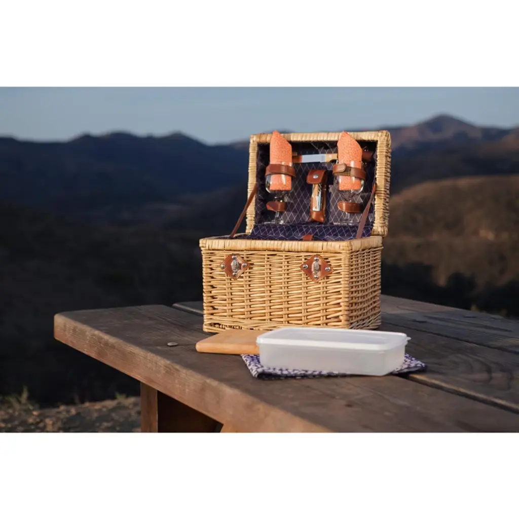 The Napa Picnic Basket, an English style willow wicker picnic basket with full picnic service for two. This romantic picnic basket features poly cotton lining and comes with 2 hand blown glasses, a hardwood cutting board, a stainless steel waiter style corkscrew, wood handled cheese knife, matching cotton napkins and tablecloth, and plastic food container. But even with all that, there is still room for a bottle, or two or three. An ideal wedding gift, birthday present, or anniversary celebration for vinophile couples and vineyard explorers.