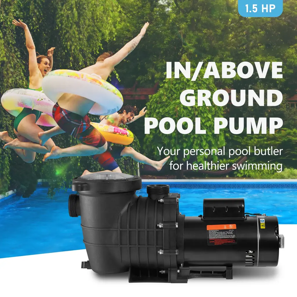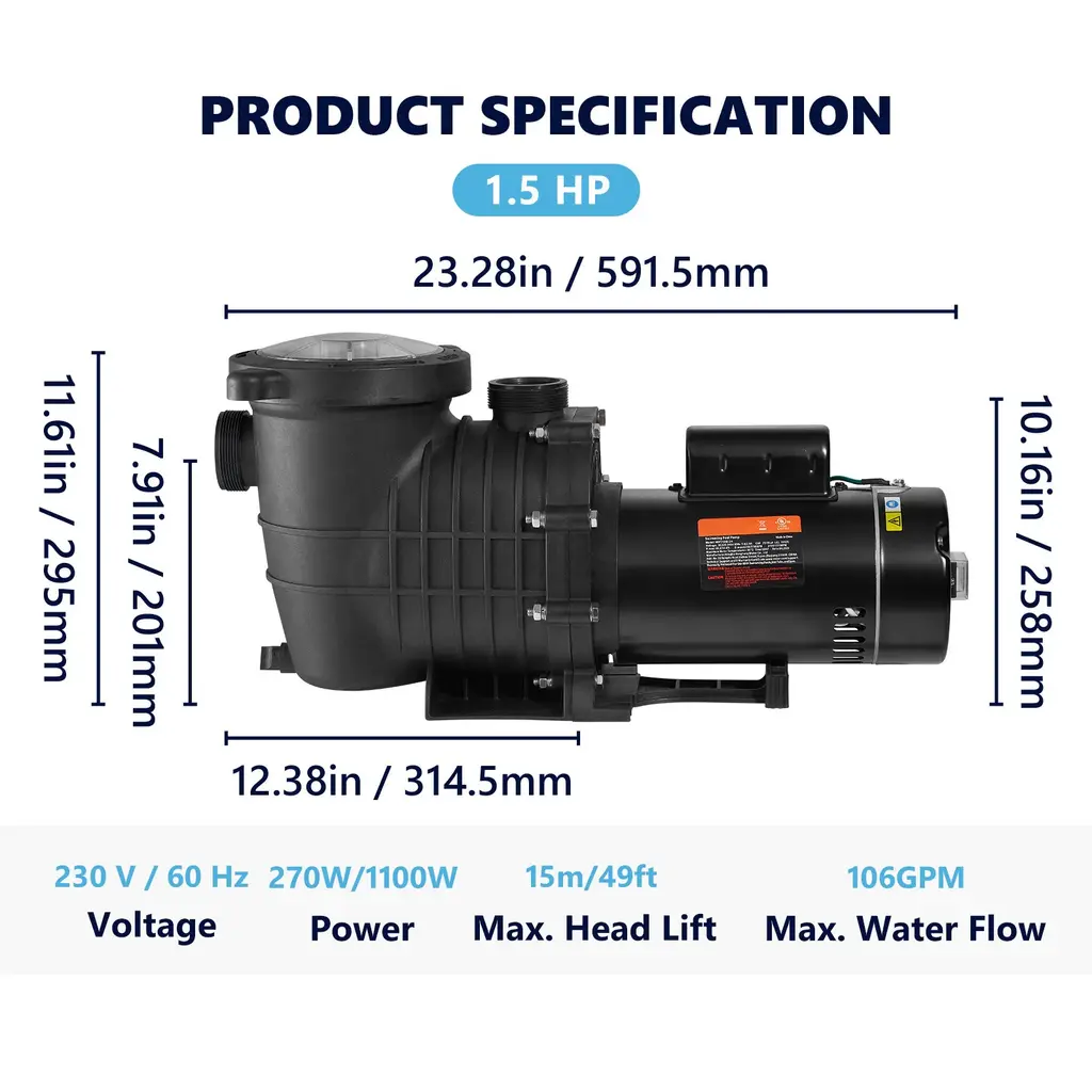 1.5 HP Premium Quality Copper Motors: Voltage: 230 V / 60 Hz. A pure copper motor with a stainless-steel motor shell provides not only an efficient and stable running but also has built-in thermal protection. Our swimming pool pump is a perfect option for circulating water filtration, constantly keeping your swimming pool crystal clear and sanitary. Note: Power cord not included. Corrosion-proof ABS Material: Different from others, our spa pump adopts an ABS shell and stainless steel shafts withstand harmful substances season after season. One-piece structure features non-leakage against wear and tear. Even water containing disinfectants can use this pump Efficient Water Circulating System: Max. Water Temperature: 104 °F. Our pool pump has two alternative speeds: high speed at 90 GPM lifting up to 49 ft and low speed at 42 GPM lifting up to 10 ft. The engineering plastics impeller can have 1750 / 3450 RPM while maintaining a low noise to filter impurities quickly. What's more, the transparent lid gives you a clear view to timely clean up the detachable extra-large filter basket. Quality Standard for Security: We always focus on the security standards of our electronic motors. Our single-speed pool pumps have successfully passed ETL certification, letting you enjoy your pool with ease of mind. An earthing terminal is also set to connect the line on the ground for an extra layer of security. Pump up the heat and enjoy our quality pump all summer long. Wide Application: The speedy pool pump is ideal for above-ground pools, hot tubs, thermal springs, spas, and irrigation systems. However, it should not be used with storable pools. It will bring you a clean and clear water environment, so you enjoy your pool all summer long. Note 1. Please fill the pump with water to keep the motor from overheating for the first use. 2. During extreme weather conditions, do not keep electrical components operating. Package Content 1 x Swimming Pool Pump 2 x Interfaces