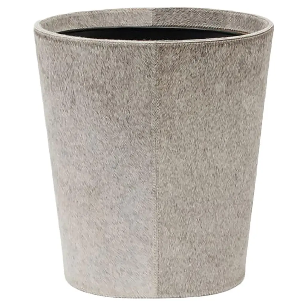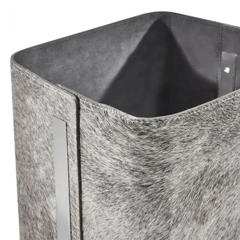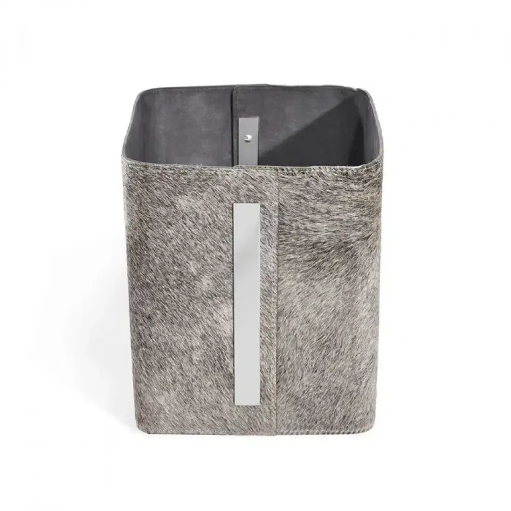 With its stunning natural hide and polished nickel metal accents, the Portia Storage Basket makes for a versatile vessel used as a wastebasket or chic storage. Hide is a natural material. Variations in color are to be expected and add to the unique charm of each piece. Our natural coloration is hand selected to include hides with predominantly grey undertones, but cream, tan and brown hues can also be expected.