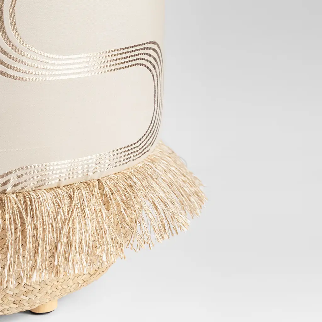 This ivory pouf is the epitome of refined taste and classy designs. Its light silk brightens up the room and would fit well both in a dark and bright interior. The curved shapes together with the cotton fringes which characterize the bottom are the features that make this decorative pouf entirely one-of-a-kind.