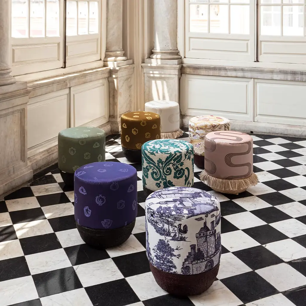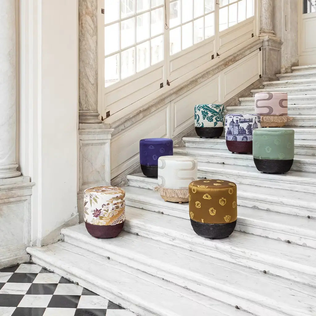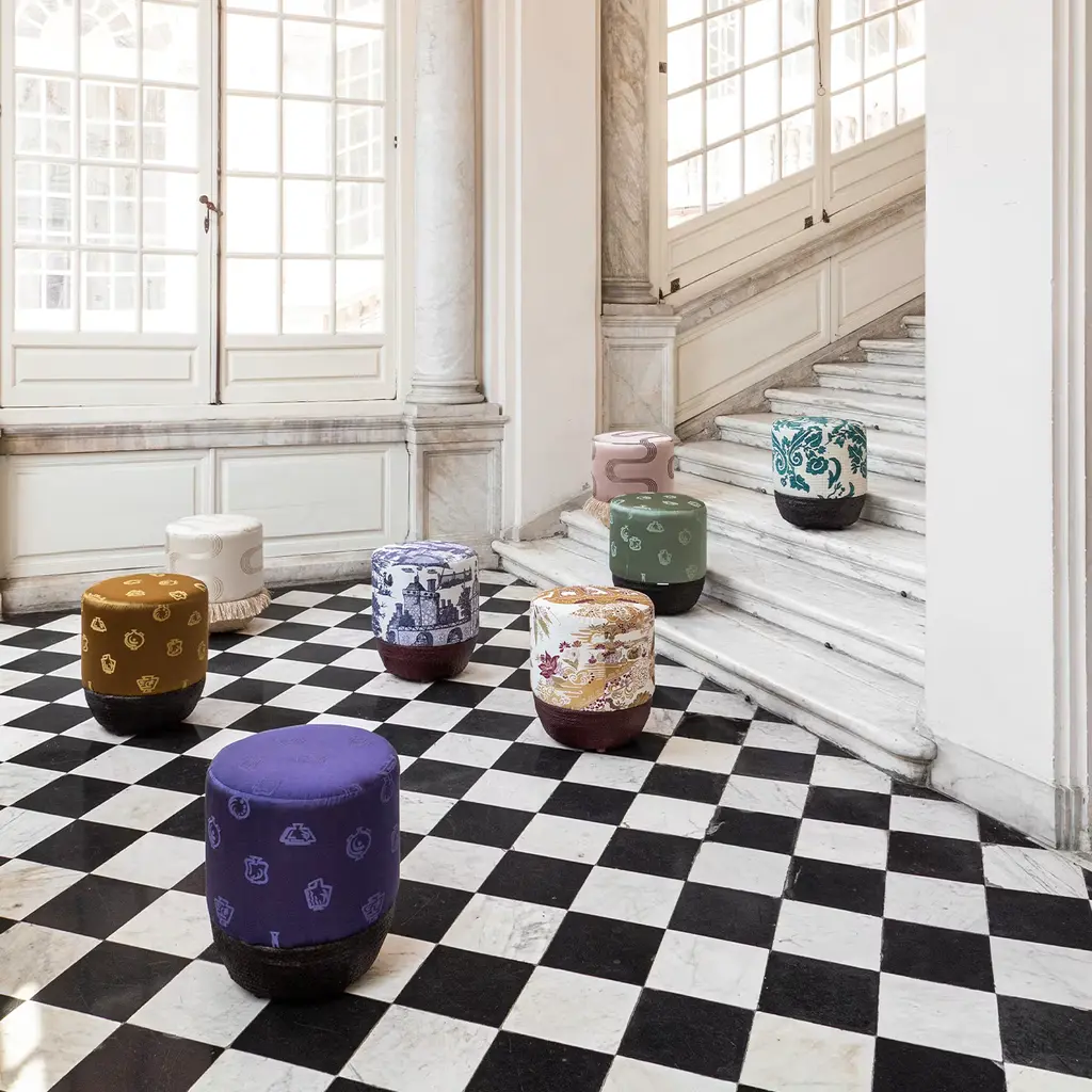 Pouf Vague Pink With Rubelli Archive Fabric And Basket Base