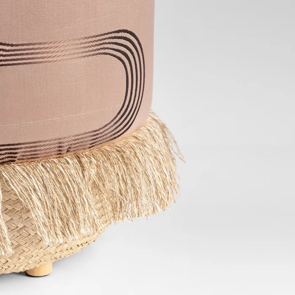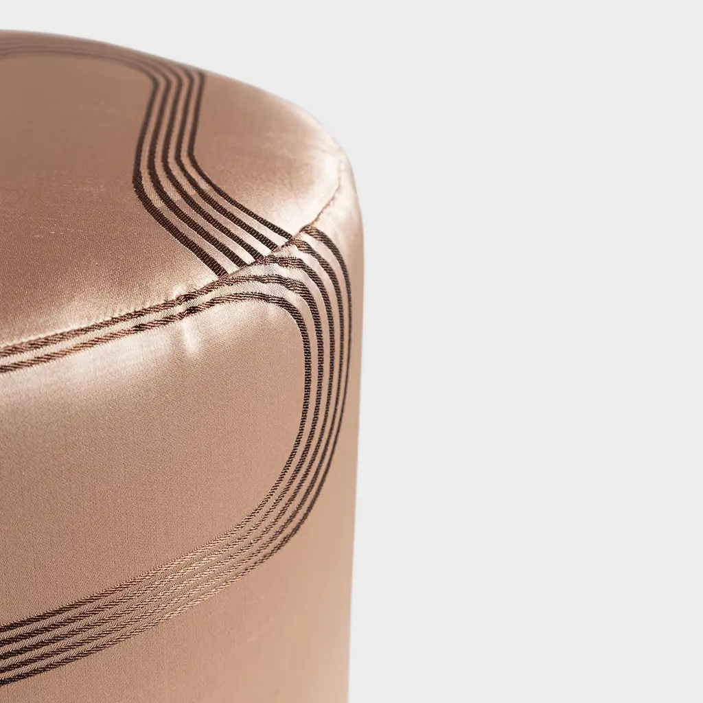 A rose-gold pouf is never the wrong choice for your interior. This one is particularly fitting because of the wavy lines which adorn the shiny silk, which give the surface a dynamic feel. The bottom is distinctive thanks to the cotton fringes that adorn it all the way around. The beige color and simple material provide a refreshing contrast with the shimmer of the silk top.