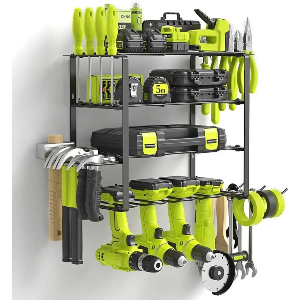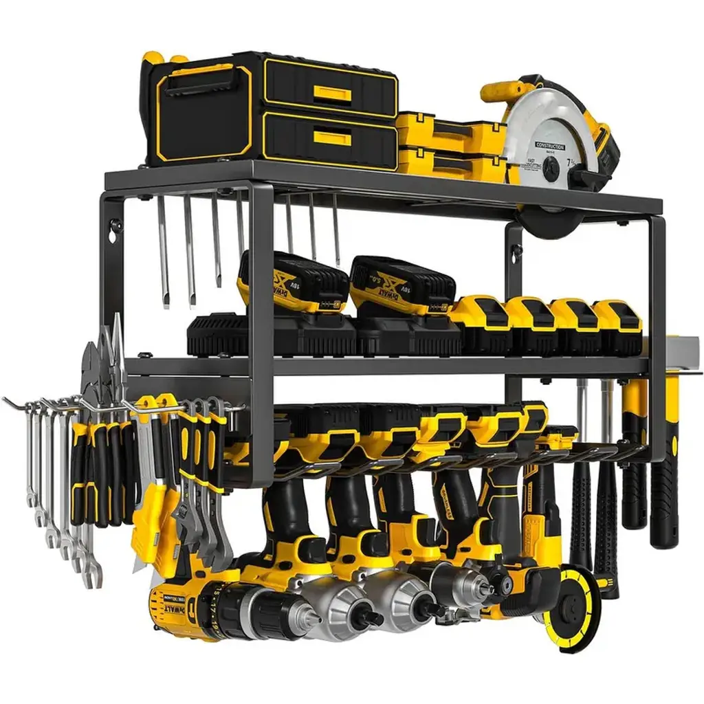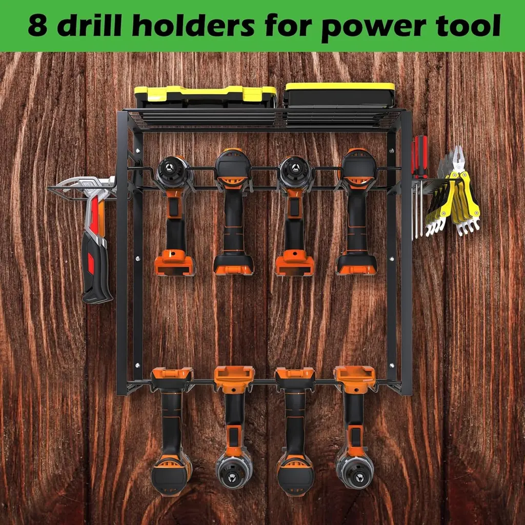 【Garage Tool Organizer with Metal Line Basket】 The top of this power tool rack is a metal line basket, large-capacity to storage small tools, tools don't easy to scroll and fall down, make full use of the wasted wall space to display and place your power & handheld tools storage, transform it into a compact & effecient area. This tool organizer helps you keep all your commonly used project tools neatly organized and within your arm's reach. 【Removable Design & Easy To Install】 This utility storage rack is removable design, easily mount using pre-drilled holes spaced 16” apart intended to screw into wood wall studs. Tool organizer wall mount comes with hardwares included 4 drywall anchors and 4 #10 pan head screws, this tool shelf reserved holes and other installation accessories, please refer to the installation manual before you assemble. You just only need a few minutes to assemble a great tool rack. 【Strong Load-Bearing Capacity】 Made from heavy gauge steel wire and plating, has three-layer design, hand-held power tools can be placed on the lower layer, the other heavy tools can be placed in the middle, small tools can be placed on the upper layer basket, and various screwdrivers and pliers can be placed on two sides, this drill holder shelf has an extra heavy weight limit of 100 pounds when mounted into studs and 50 pounds when using wall anchors, which has a strong load-bearing capacity. 【Universal Style & Perfect Size】 The simple lines & compact design of this wall mounted tool holder make it an excellent choice for all design schemes. The 16.73” width, 7.87” depth, and 10.43” height is a perfect size to organize all kinds of garage stuff like cordless drills, charging stations, screwdrivers, rolling tool, hardware. The garage organization and storage can be hanged on garage, tool room, workshop etc. and makes a great Father's Day gift idea.