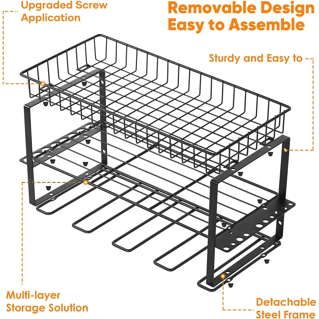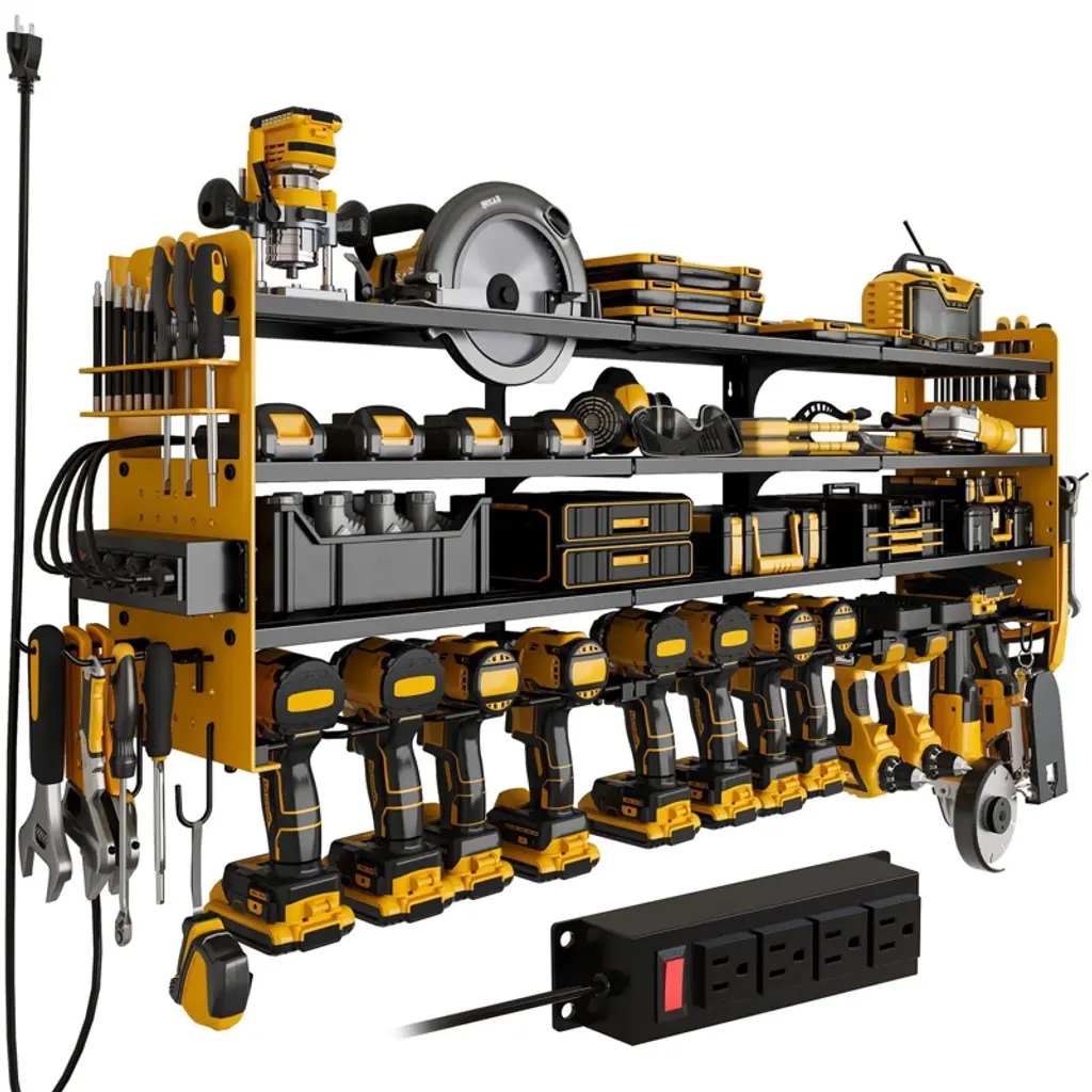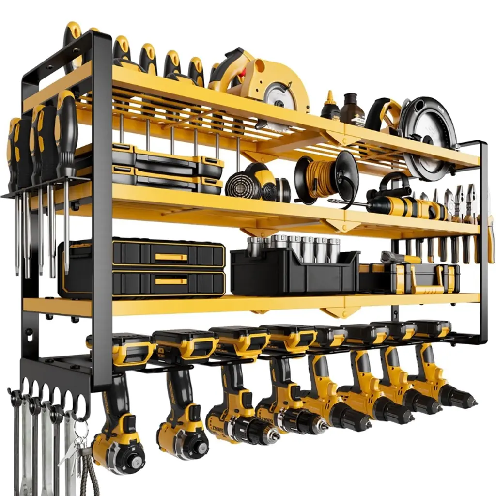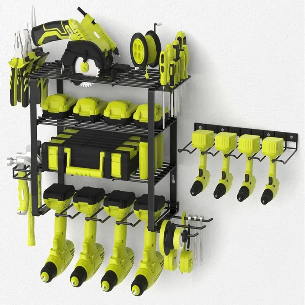 【Garage Tool Organizer with Metal Line Basket】 The top of this power tool rack is a metal line basket, large-capacity to storage small tools, tools don't easy to scroll and fall down, make full use of the wasted wall space to display and place your power & handheld tools storage, transform it into a compact & effecient area. This tool organizer helps you keep all your commonly used project tools neatly organized and within your arm's reach. 【Removable Design & Easy To Install】 This utility storage rack is removable design, easily mount using pre-drilled holes spaced 16” apart intended to screw into wood wall studs. Tool organizer wall mount comes with hardwares included 4 drywall anchors and 4 #10 pan head screws, this tool shelf reserved holes and other installation accessories, please refer to the installation manual before you assemble. You just only need a few minutes to assemble a great tool rack. 【Strong Load-Bearing Capacity】 Made from heavy gauge steel wire and plating, has three-layer design, hand-held power tools can be placed on the lower layer, the other heavy tools can be placed in the middle, small tools can be placed on the upper layer basket, and various screwdrivers and pliers can be placed on two sides, this drill holder shelf has an extra heavy weight limit of 100 pounds when mounted into studs and 50 pounds when using wall anchors, which has a strong load-bearing capacity. 【Universal Style & Perfect Size】 The simple lines & compact design of this wall mounted tool holder make it an excellent choice for all design schemes. The 16.73” width, 7.87” depth, and 10.43” height is a perfect size to organize all kinds of garage stuff like cordless drills, charging stations, screwdrivers, rolling tool, hardware. The garage organization and storage can be hanged on garage, tool room, workshop etc. and makes a great Father's Day gift idea.