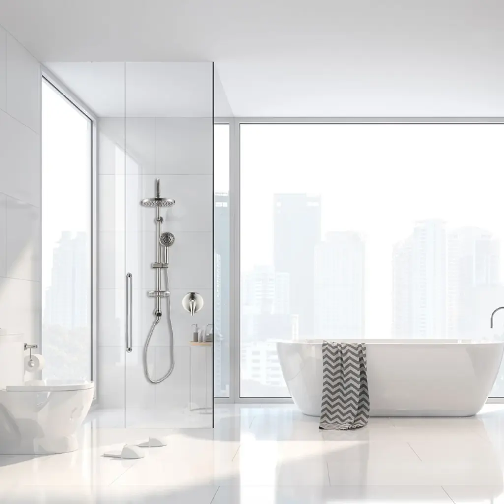 Looking to replace your old wall shower with a new and improved 1. Look no further than the PROOX Shower System with Hand Shower. This stainless steel retrofit shower set is designed to provide you with the ultimate showering experience. With 2 showering options, including a 5-spray hand shower with a height-adjustable holder and an overhead rainfall shower head, you can customize your showering experience to your liking. The diverter makes it easy to switch between the 2 options. Additionally, the soap basket can be adjusted up and down on the rail, making it more convenient for users of different heights (maximum adjustment distance 22 in.). It comes with a shower valve to control hot and cold water.
