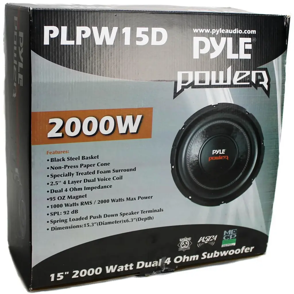 The Pyle PLPW15D is a 15 Inch, 2000 watt subwoofer designed with the bass lover in mind. This subwoofer will make your music growl in your vehicle or at home, in any type of enclosure: sealed, vented, or open air. The black steel basket and non press paper cone look sleek and the 95 oz. magnet, 2.5 Inch four layer dual voice coil, and specially treated foam surround, make it sound great too. Black Steel Basket Non Press Paper Cone Dual 4 Ohm Impedance 1 buy = 1 subwoofer