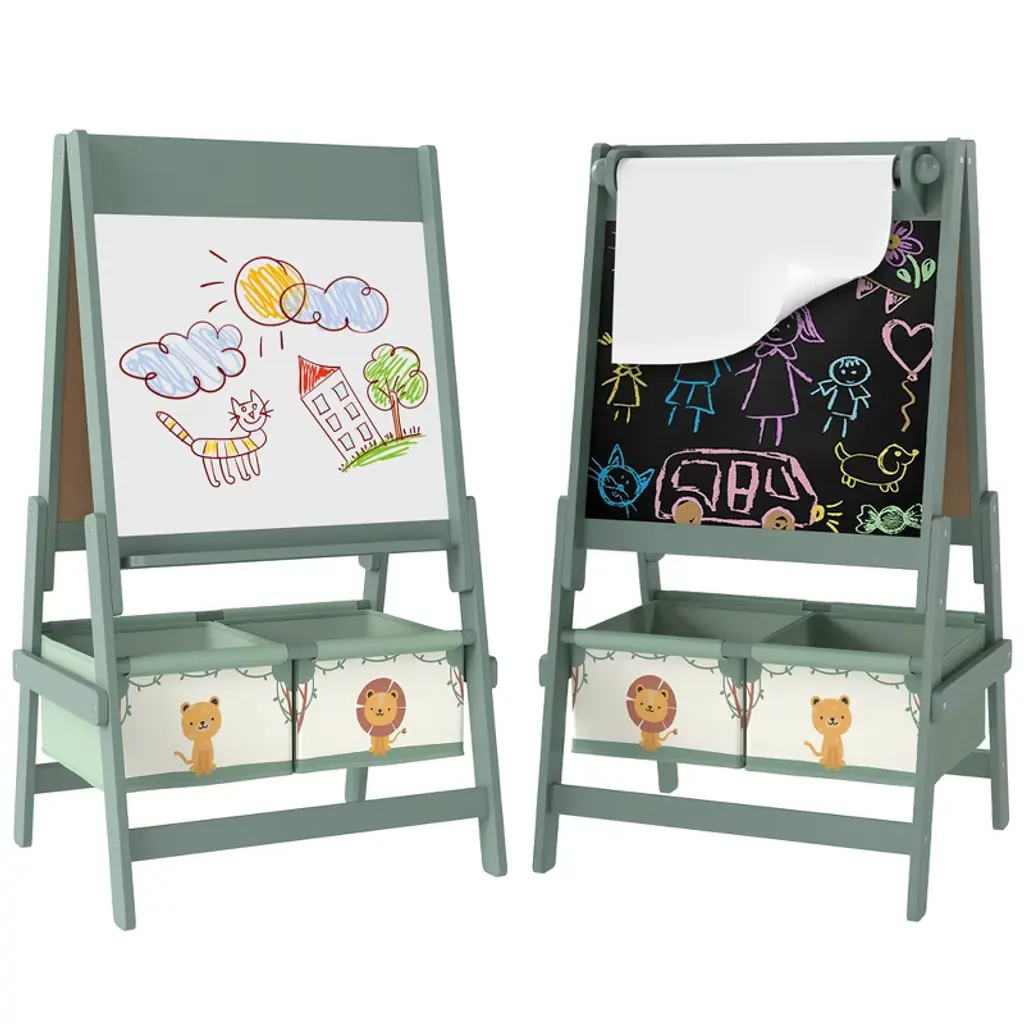 Unleash your child's creativity with a versatile and stylish easel for kids by Qaba. Whether your child is sketching, doodling, or practicing letters, it will keep them engaged and entertained as they switch effortlessly between blackboard, whiteboard, and paper roll for different art mediums. This kid's whiteboard has convenient storage baskets, keeping all their art essentials neatly organized and easily accessible. Introduce your toddler to art, and watch them build skills for a lifetime.