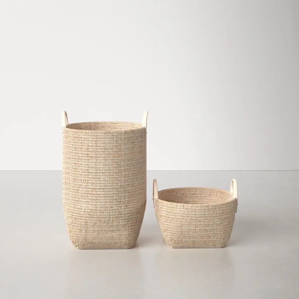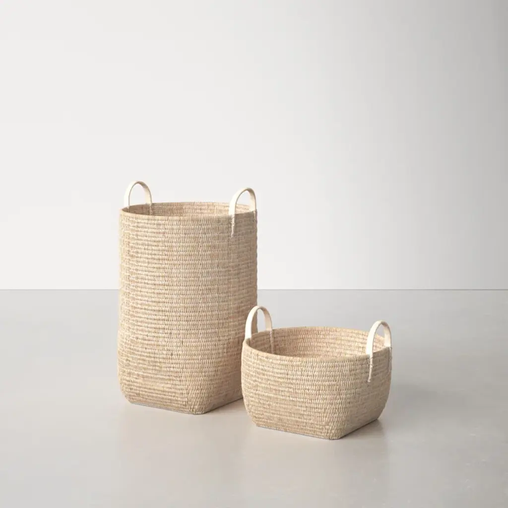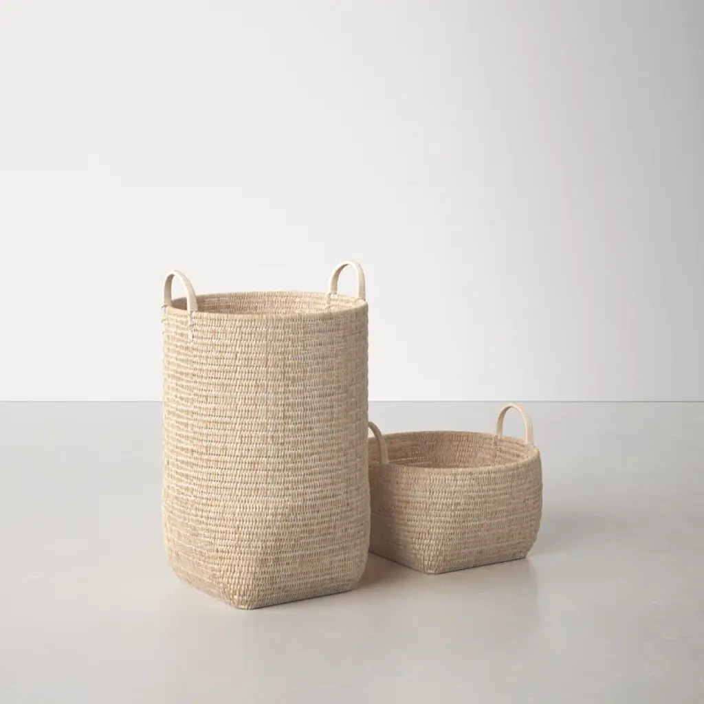 Crafted from tightly woven natural rattan, these baskets showcase organic texture + earthy tones. Built-in handles make them easy to tote, and a set of two sizes creates cohesive storage for laundry, blankets, or all the clutter in your living room ten minutes before guests arrive.