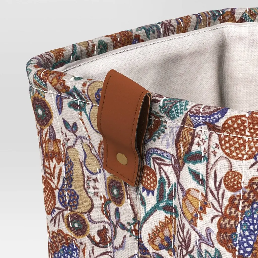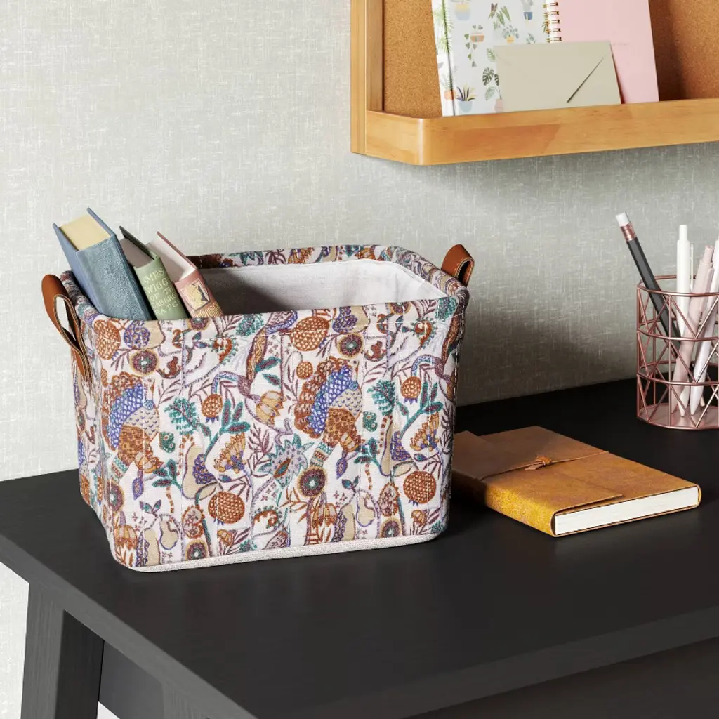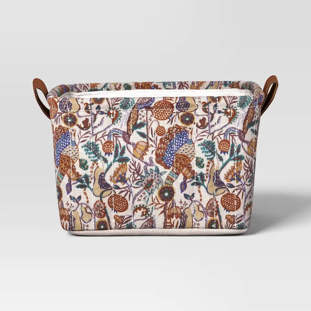 Bring function and decorative style to your indoor space with this Floral Quilted Decorative Basket from Threshold™. This rectangular decorative basket features a quilted fabric construction with colorful floral print for charming style. Designed with attached faux-leather handles for easy portability, this quilted basket features an open top to let you store anything from books to small throws and beyond.Threshold™: Looks like home, feels like you.