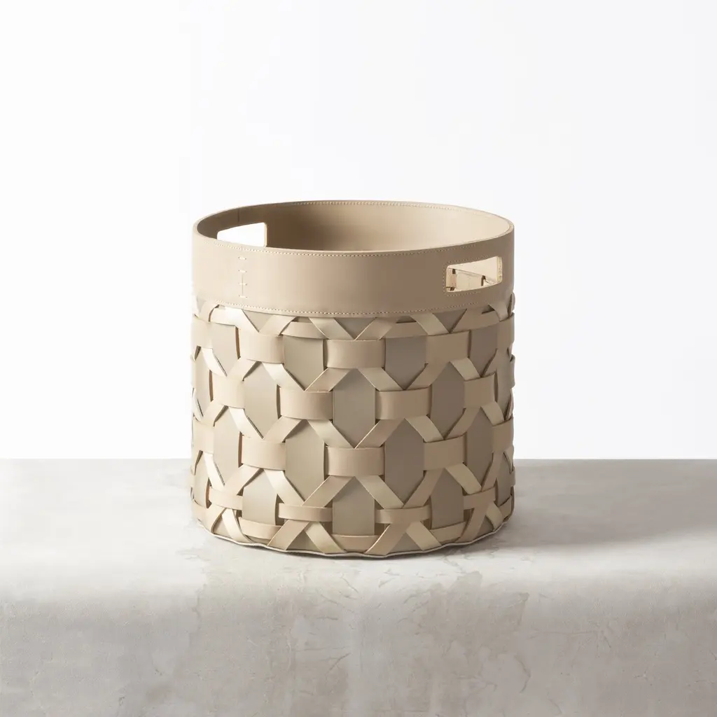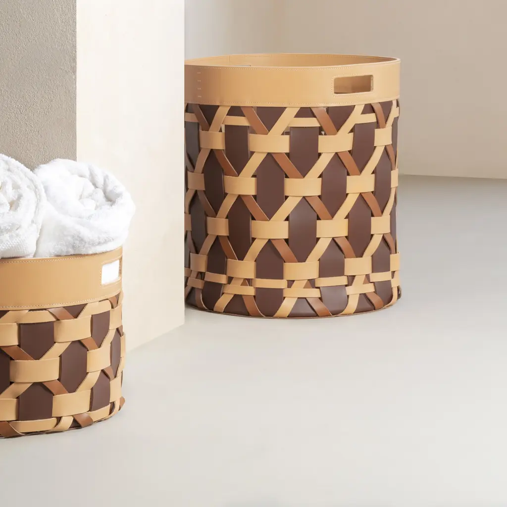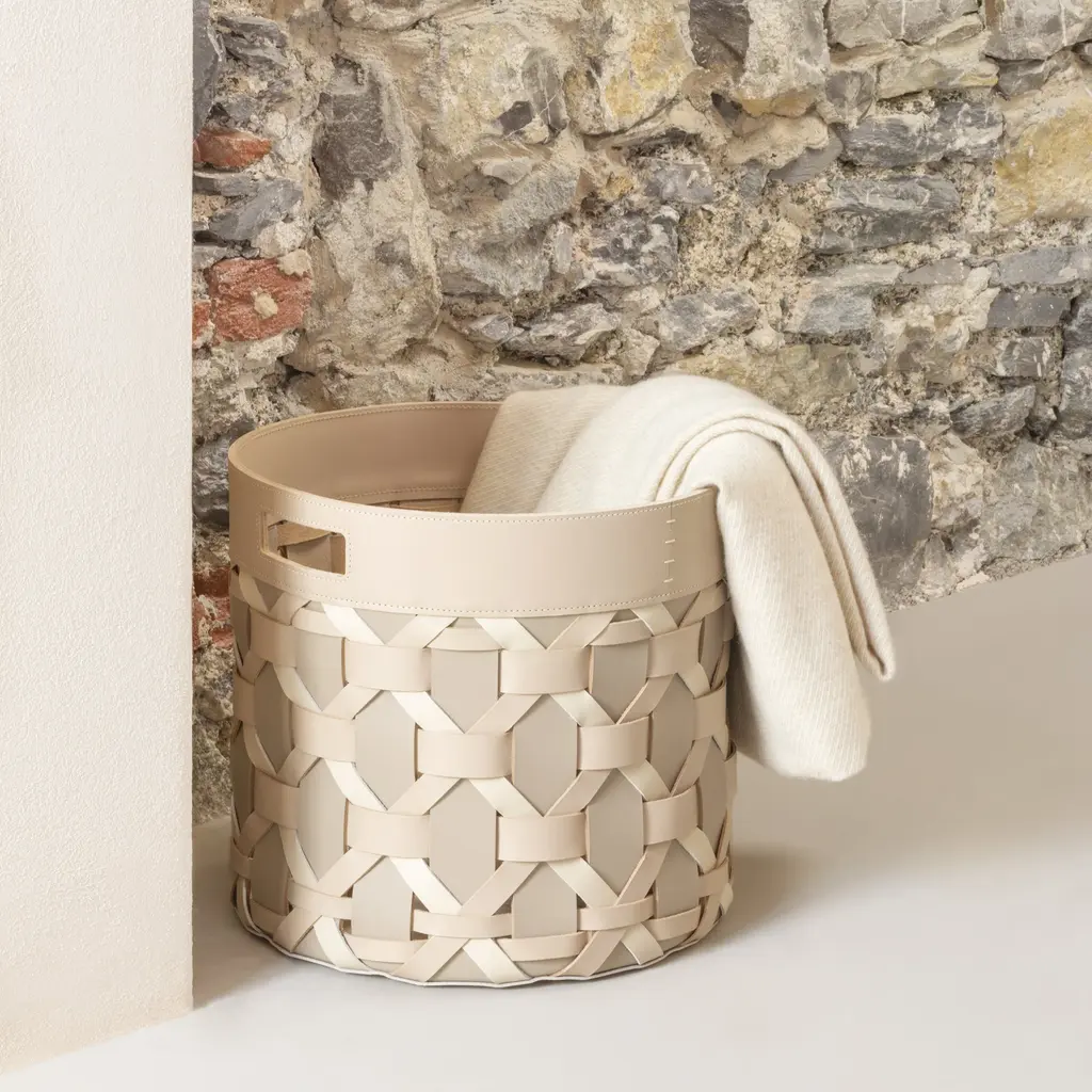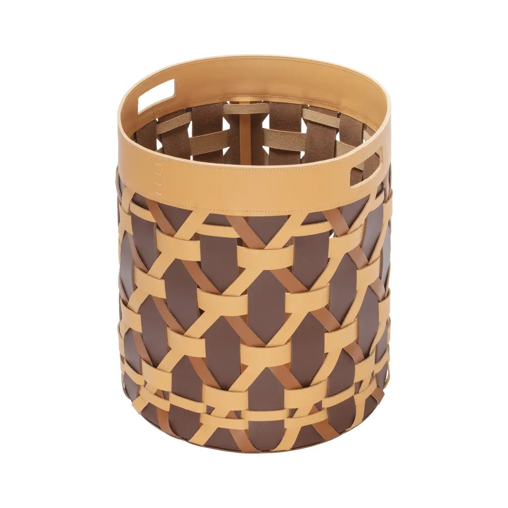 A masterful display of multi-tonal artistry, the 1969 Palu No.2 Storage Basket is a testament to the intricate craft of the Giobagnara and Rabitti 1969 collaboration. Expertly handcrafted in Italy, this piece is created by meticulously braiding strips of saddle leather in three complementary hues. This technique produces a rich, textural object with stunning visual depth and a sturdy, yet flexible, structure. A fusion of heritage craftsmanship and sophisticated color theory, it brings tactile luxury and organized beauty to any living space. Highlights: