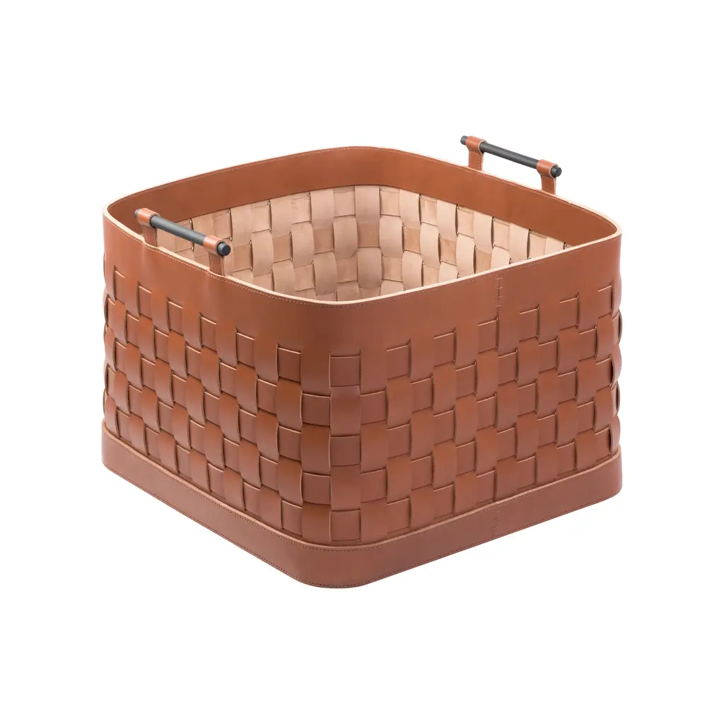 Inspired by the intricate mosaics of its namesake city, the Ravenna Basket is a masterpiece of artisanal weaving from Giobagnara and Rabitti 1969. Expertly handcrafted in Italy, this piece is created from strips of water-resistant saddle leather, meticulously braided into a sturdy yet flexible form. The rich, textural body is complemented by elegant brushed bronze handles, adding a touch of warmth. A fusion of heritage craft and timeless design, it brings tactile luxury and organized calm to any living space. Highlights: