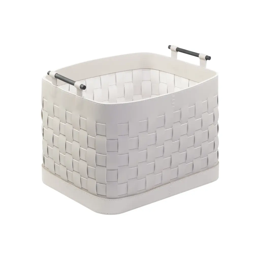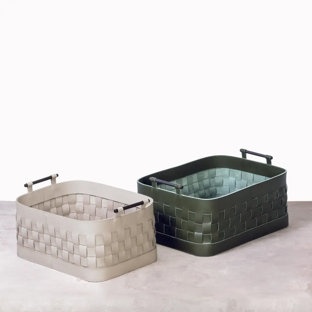 Inspired by the intricate mosaics of its namesake city, the Ravenna Basket is a masterpiece of artisanal weaving from Giobagnara and Rabitti 1969. Expertly handcrafted in Italy, this piece is created from strips of water-resistant saddle leather, meticulously braided into a sturdy yet flexible form. The rich, textural body is complemented by elegant brushed bronze handles, adding a touch of warmth. A fusion of heritage craft and timeless design, it brings tactile luxury and organized calm to any living space. Highlights: