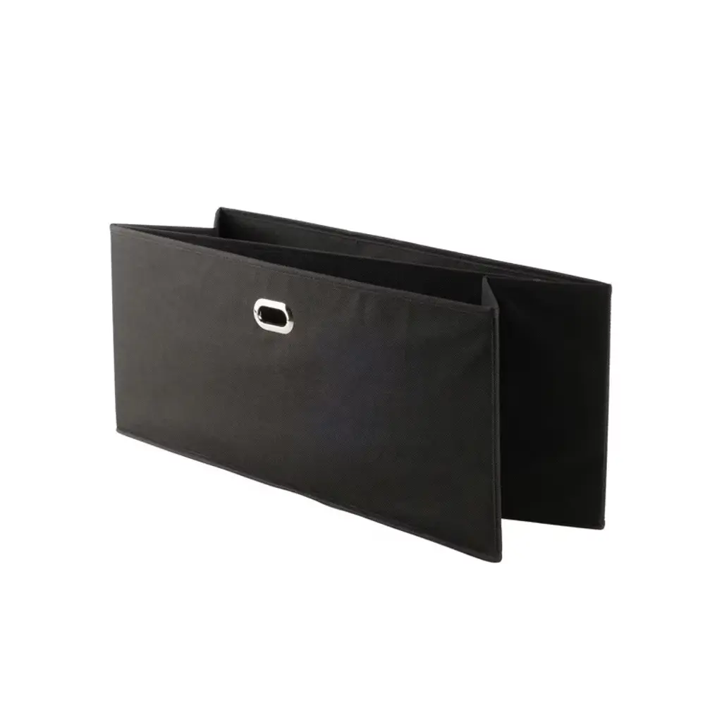 Keep your shelves organized and looking great with the 2-piece Torino Baskets. Store everything from sweaters; shoes; and towels to toys and games in these foldable fabric baskets. With a 10.2" depth; they fit easily on any closet shelf or freestanding shelf unit. Carrying them is easy and secure with metal ring handles. Made of fiberboard reinforced black fabric; these foldable baskets are a perfect organizational tool. Open size 233"W x 10.2"D x 10.2"H.