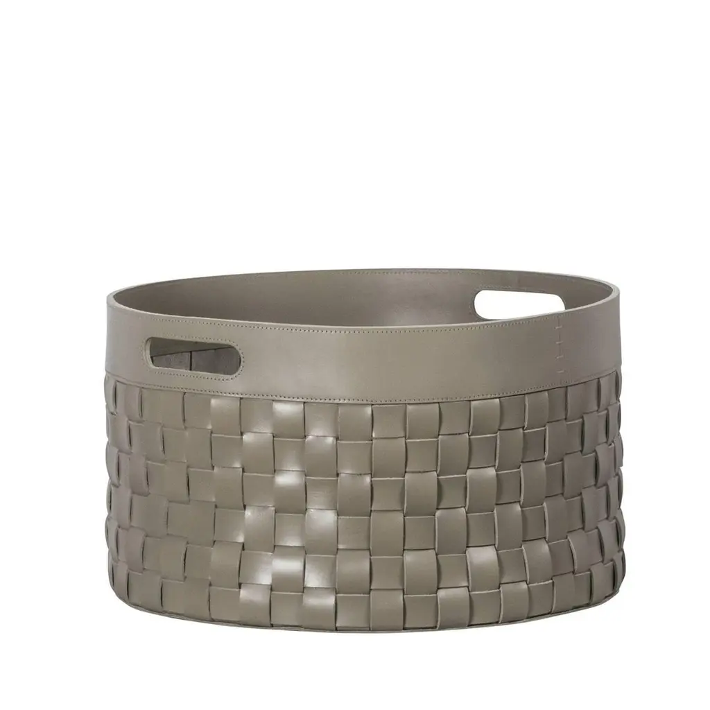 Part of the Ravenna Collection, this rectangular basket is a versatile object of functional decor that will provide precious storage and display space, while also adding a striking decorative accent to a modern interior. Best showcased in a living room to hold magazines or in a study to neatly arrange desk complements, this basket will be eye-catching and sophisticated. Its structure is made of braided strips of water-resistant saddle leather vegetable-dyed in a deep forest green hue. Two cylindrical handles in brushed bronze complete the piece.