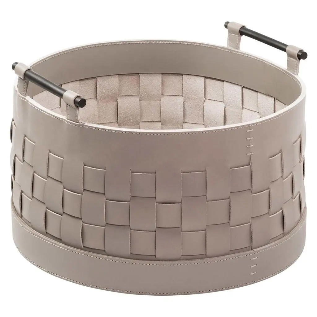 A superb object of functional decor, this round basket is part of the Ravenna Collection, providing precious storage space while also being a striking piece to showcase in a modern home. In a powder room to hold guest towels, on a vanity to neatly store beauty products, or in a living room as a stylish magazine holder, this will be a stunning addition to any room. Its round structure features brushed bronze handles and a body in water-resistant saddle leather woven strips dyed using vegetable pigments in a sophisticated shade of gray.