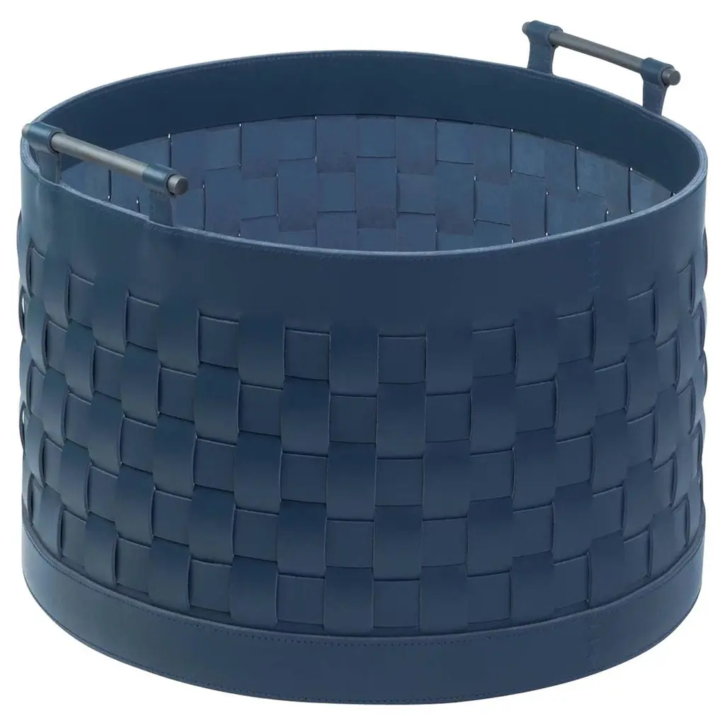 Part of the Ravenna Collection, this rectangular basket features tall sides and two cylindrical brushed bronze handles that allow it to be easily moved. Elegantly crafted and striking with its braided water-resistant strips in saddle leather dyed white with vegetable pigments, this basket is a splendid addition to a contemporary living room as a magazine holder or modern guest bathroom or poolside for towels and other outdoor-style necessities.