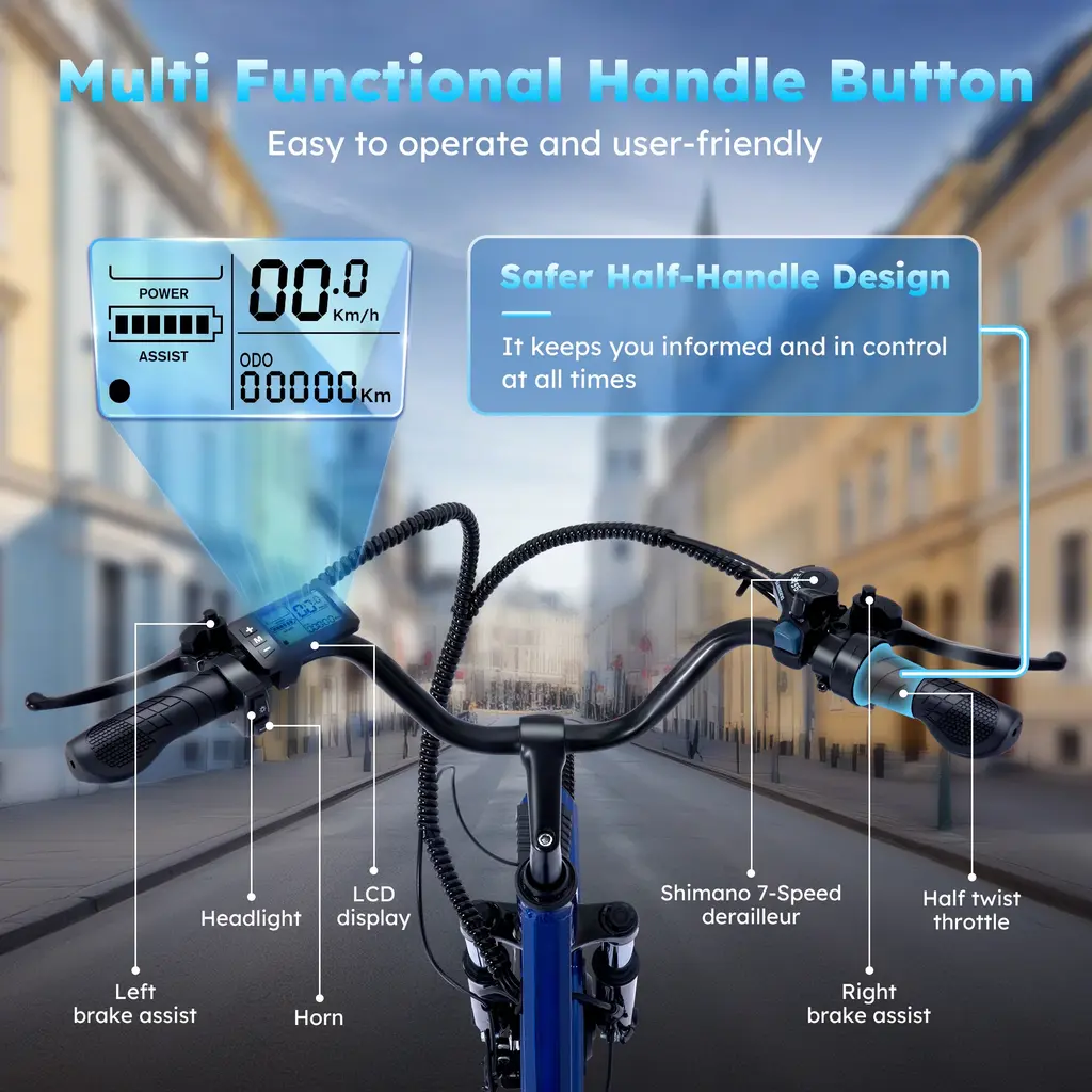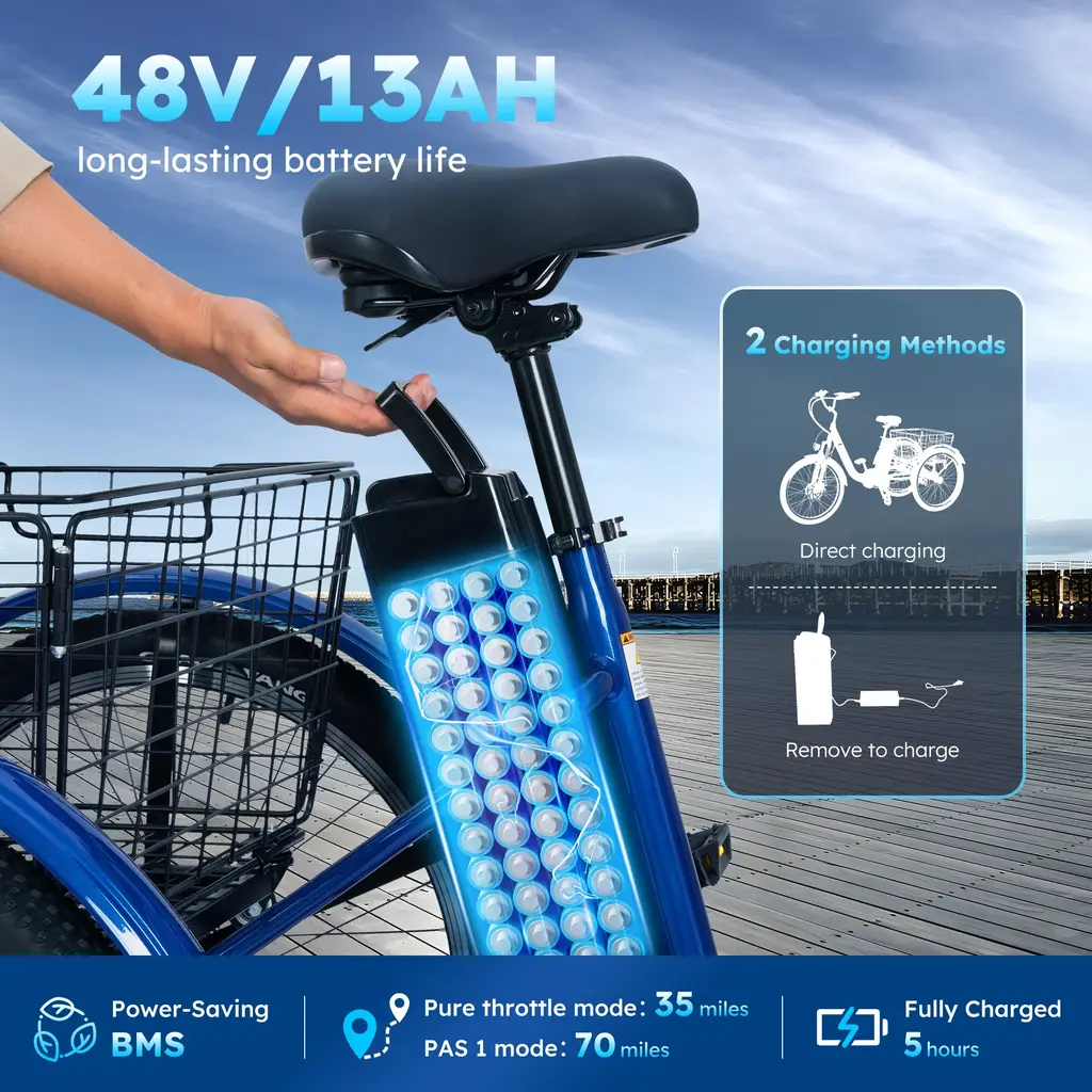 Experience the freedom of exploration with our electric tricycle, featuring an upgraded spacious removable cargo basket that makes it the perfect companion for shopping, camping, or running errands. Powered by a 48V 13Ah lithium battery that charges in just 5-6 hours, you can travel up to 30 miles in full-electric mode or 50 miles in pedal-assist mode, enjoying ultimate flexibility with three versatile riding modes. This e-trike is designed to adapt safely and conveniently to all terrains,