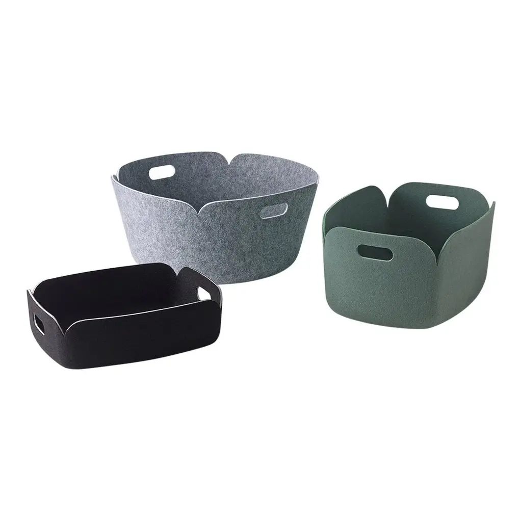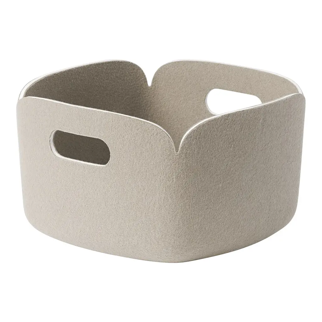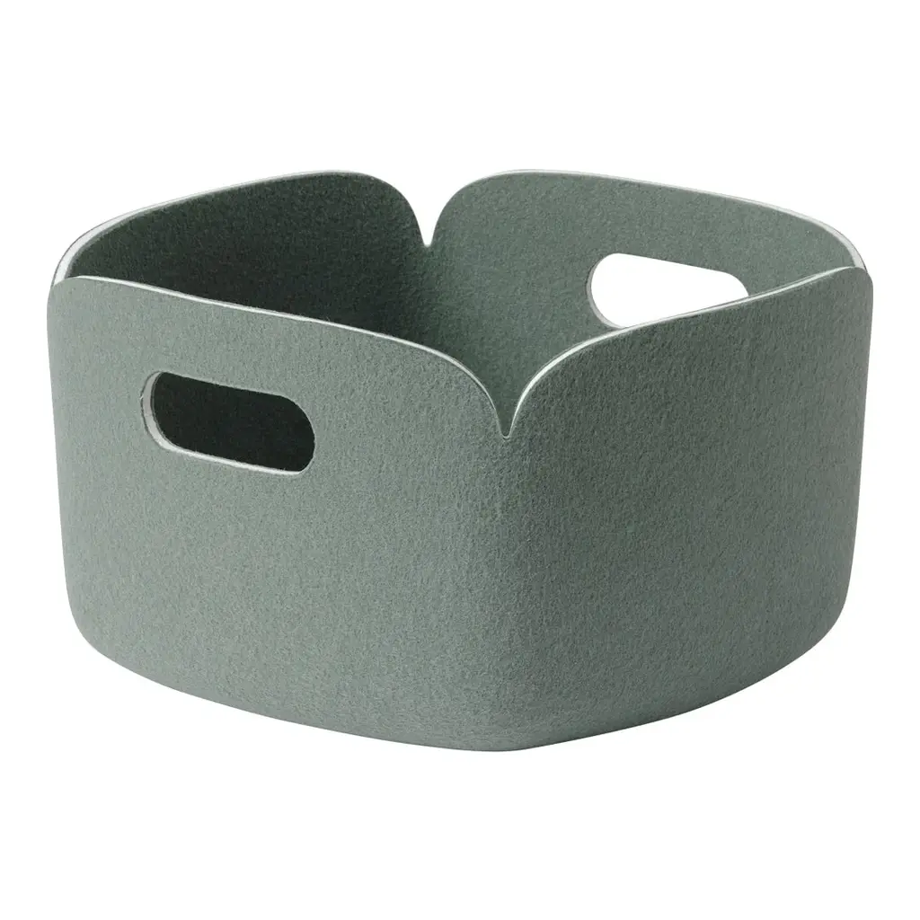The Restore Basket by Mika Tolvanen for Muuto transforms sustainable design into beautiful storage, offering versatile organization perfect for living rooms, bedrooms, home offices, or entryways. This innovative Scandinavian storage basket elevates everyday tidying through thoughtful design that combines environmental responsibility with the refined aesthetics expected from premium Danish furniture. Constructed from 100% recycled plastic bottle fibers transformed into soft polymer felt, the Muuto Restore Basket challenges traditional storage materials while delivering exceptional durability and tactile appeal. Tolvanen's signature softly rounded silhouette breaks from utilitarian basket design, creating a friendly, non-obtrusive presence that seamlessly integrates into contemporary interiors from minimalist to mid-century modern styles. Available in sophisticated colorways including Black Melange with distinctive flecked texturing, timeless Midnight Blue, and fresh Aqua, each Restore Basket adds visual depth and personality to any room. The innovative recycled PET fiber construction creates surprisingly lightweight yet sturdy storage that maintains its shape and soft appearance through daily use, whether organizing throw blankets and magazines in living spaces or corralling toys and linens in bedrooms. Finnish designer Mika Tolvanen developed the Restore series in his Helsinki studio with the philosophy that "baskets should have a welcoming and distinct expression." The result is storage furniture that enhances rather than hides within your interior design, offering practical organization for newspapers, firewood, clothing, office supplies, or seasonal items while contributing to your home's sustainable story. Perfect for multiple room applications and versatile enough to complement various interior styles, the Muuto Restore Basket by Mika Tolvanen delivers both functional storage solutions and conscious design that transforms everyday organization into moments of Scandinavian sophistication.