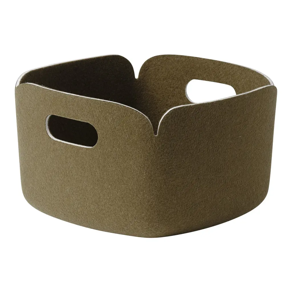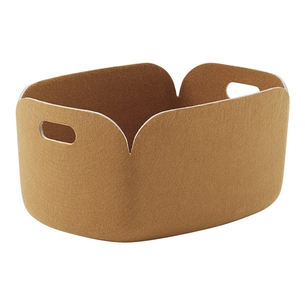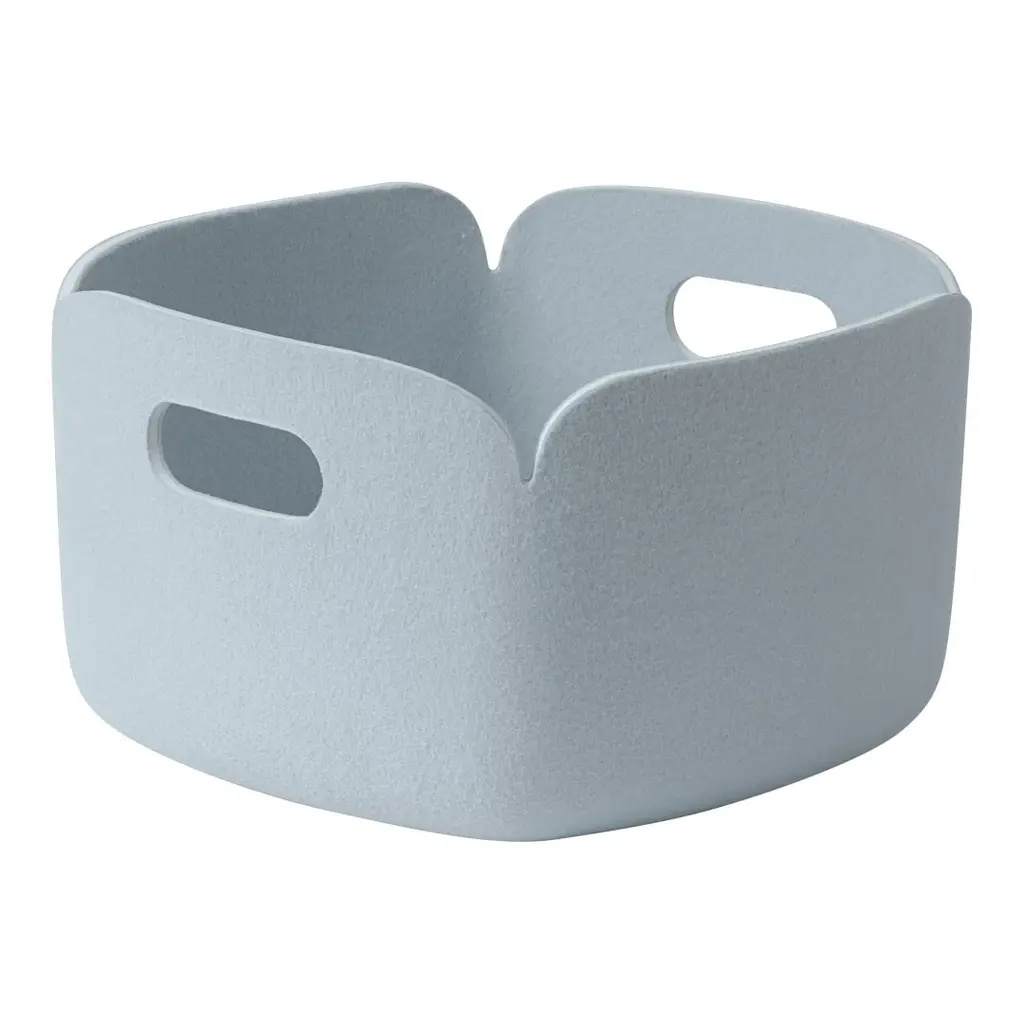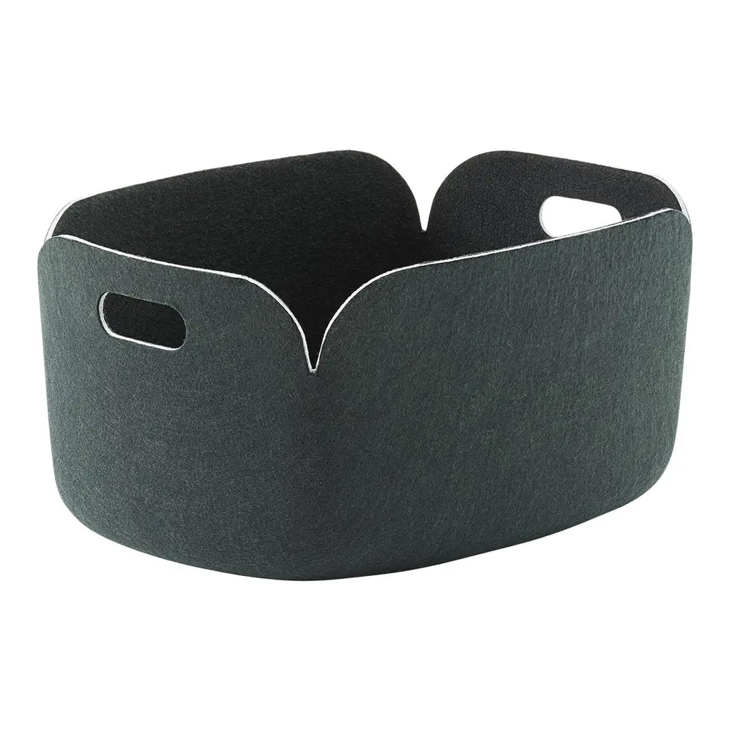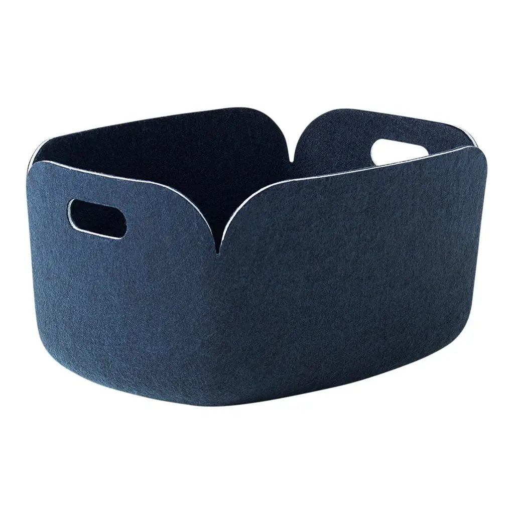 The Restore Basket by Mika Tolvanen for Muuto transforms sustainable design into beautiful storage, offering versatile organization perfect for living rooms, bedrooms, home offices, or entryways. This innovative Scandinavian storage basket elevates everyday tidying through thoughtful design that combines environmental responsibility with the refined aesthetics expected from premium Danish furniture. Constructed from 100% recycled plastic bottle fibers transformed into soft polymer felt, the Muuto Restore Basket challenges traditional storage materials while delivering exceptional durability and tactile appeal. Tolvanen's signature softly rounded silhouette breaks from utilitarian basket design, creating a friendly, non-obtrusive presence that seamlessly integrates into contemporary interiors from minimalist to mid-century modern styles. Available in sophisticated colorways including Black Melange with distinctive flecked texturing, timeless Midnight Blue, and fresh Aqua, each Restore Basket adds visual depth and personality to any room. The innovative recycled PET fiber construction creates surprisingly lightweight yet sturdy storage that maintains its shape and soft appearance through daily use, whether organizing throw blankets and magazines in living spaces or corralling toys and linens in bedrooms. Finnish designer Mika Tolvanen developed the Restore series in his Helsinki studio with the philosophy that "baskets should have a welcoming and distinct expression." The result is storage furniture that enhances rather than hides within your interior design, offering practical organization for newspapers, firewood, clothing, office supplies, or seasonal items while contributing to your home's sustainable story. Perfect for multiple room applications and versatile enough to complement various interior styles, the Muuto Restore Basket by Mika Tolvanen delivers both functional storage solutions and conscious design that transforms everyday organization into moments of Scandinavian sophistication.